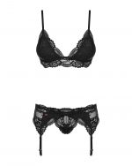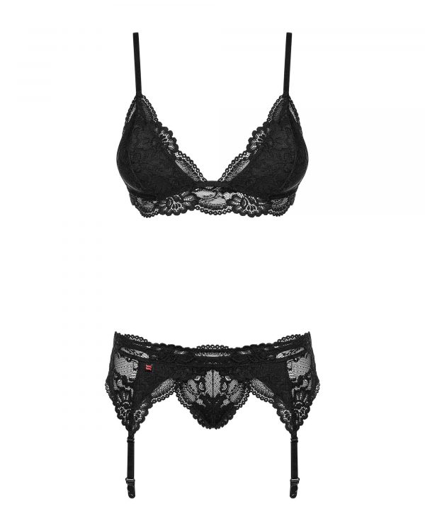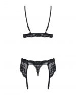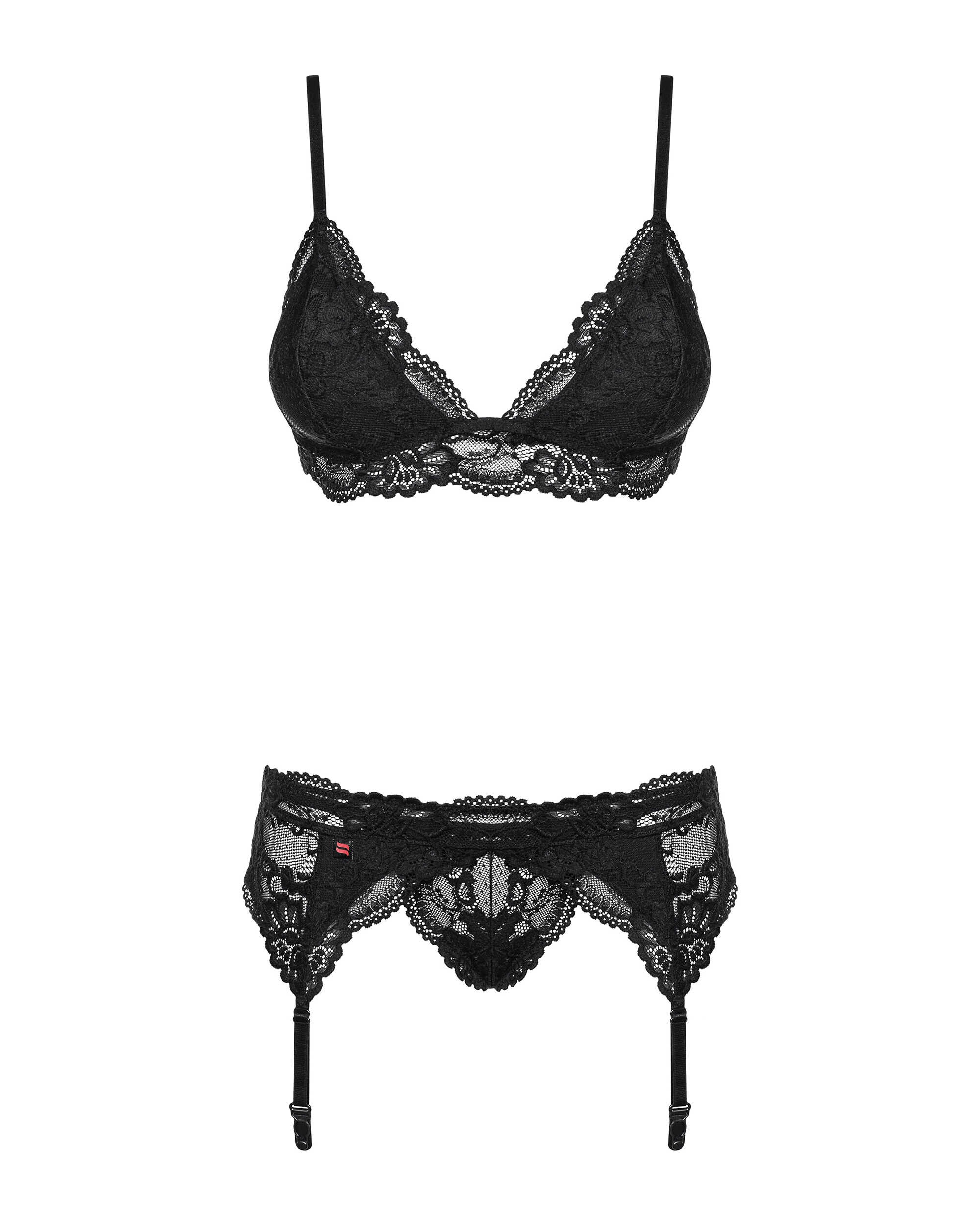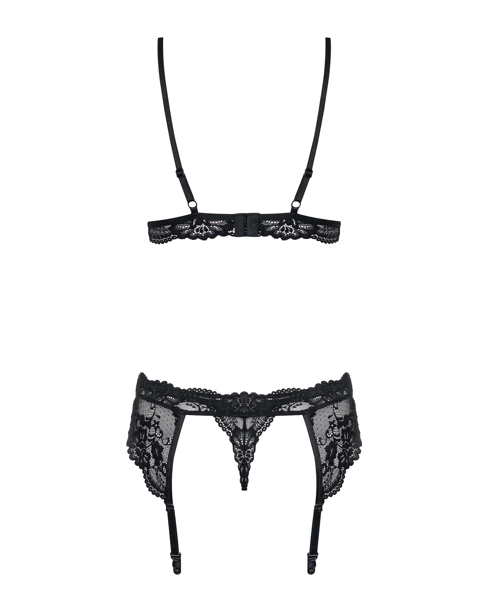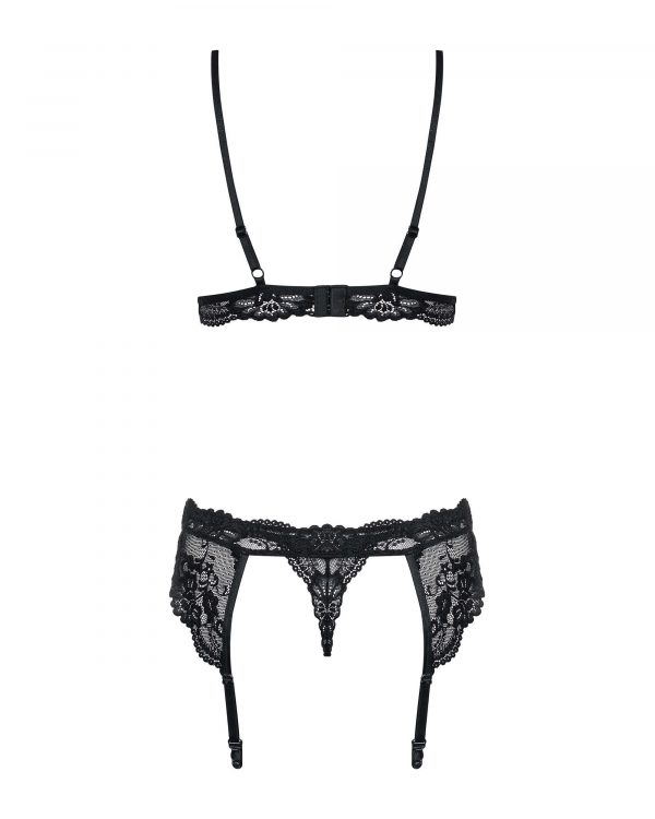Dentelle noire, beaux motifs et design ardent sculptant votre silhouette – c’est votre recette pour une journ�e parfaite et une nuit inoubliable. Montrez lui une version de vous qu’il ne connait pas encore… Mettez cet ensemble et d�couvrez tout le plaisir qu’il procure lorsque vous commencez � jouer avec votre bien-aim� ! D�tails : Ensemble de lingerie noir comprenant soutien-gorge, porte-jarretelles et stringSoutien-gorge ajustable gr�ce � ses bretelles et sa fermeture�Bonnets confortables maintiennent la poitrine�D�tail en dentelle sur tout l’ensembleString noir sexy inclusTissus doux et �lastiques (90% polyamide, 10% �lasthanne)