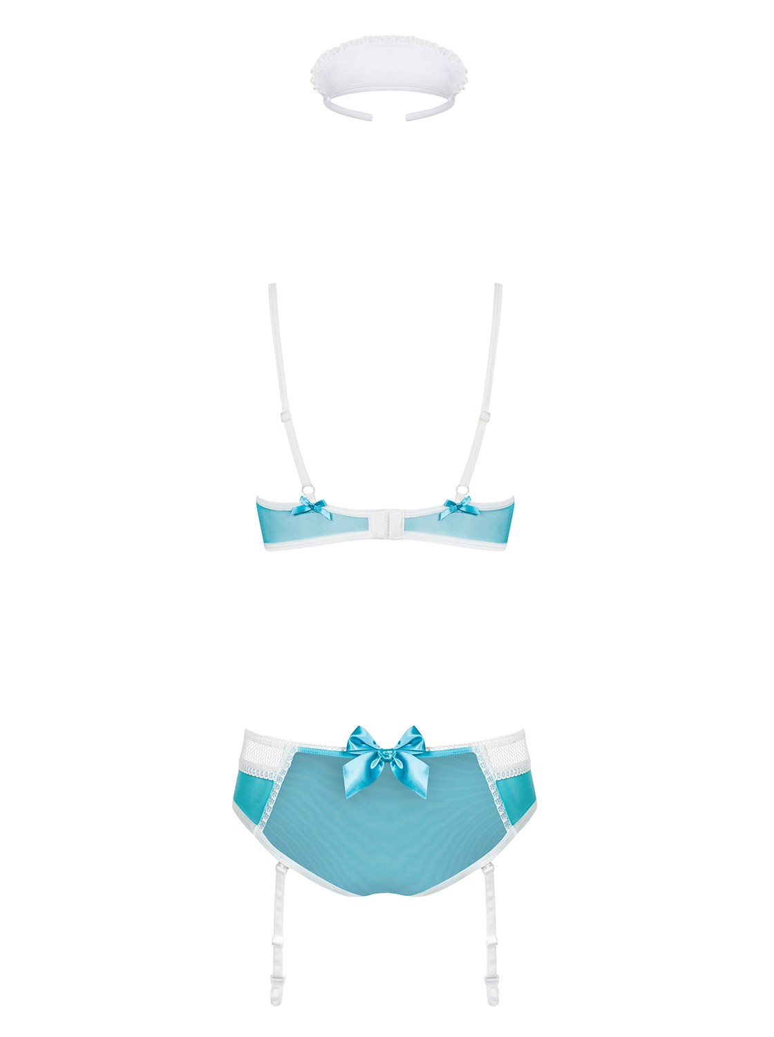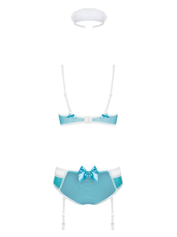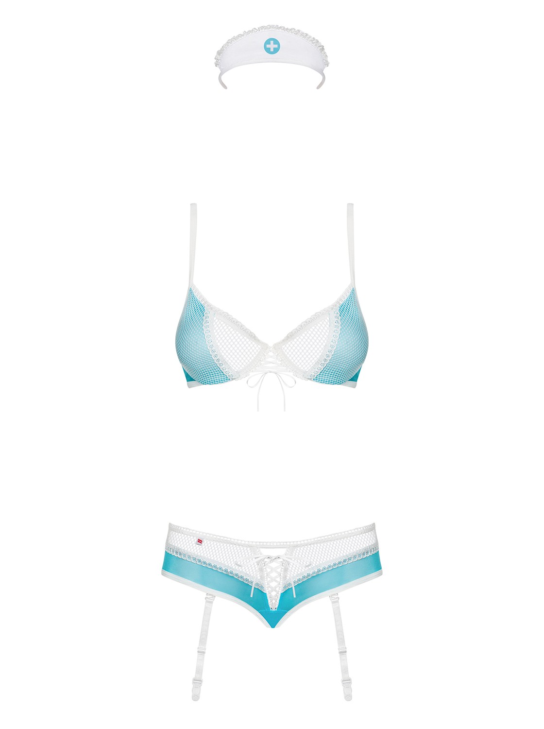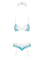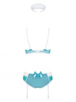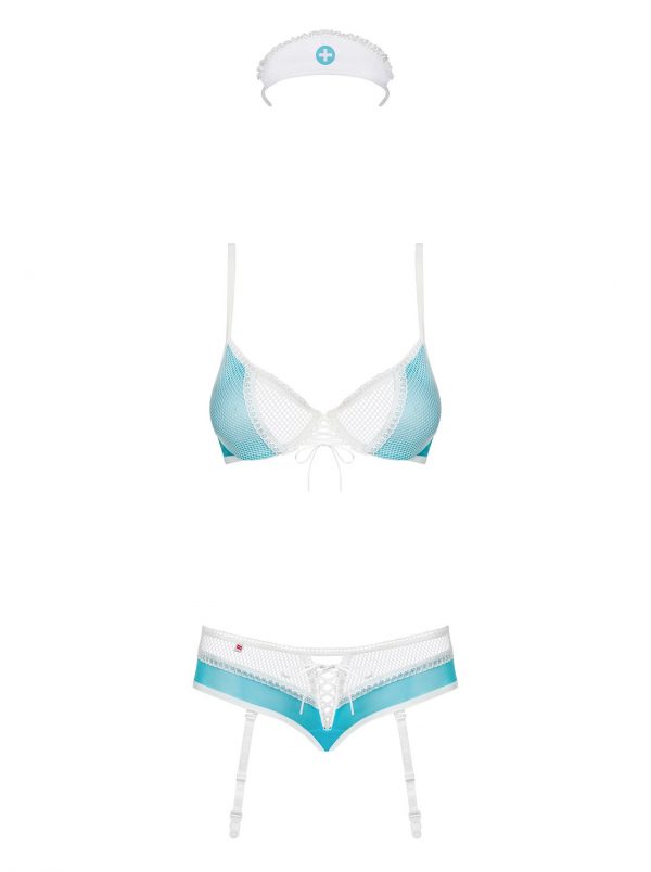 Un costume sexy d’infirmière coquine, avec soutien-gorge à armatures pour un buste parfait. Le laçage flirt entre les tasses et les culottes pour un effet torride. Les bretelles jarretelles sont détachables et réglables. Le produit comprend un soutien-gorge à armatures, un bandeau, des culottes avec des jarretières. 94% Polyamide, 6% Elasthanne