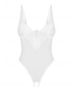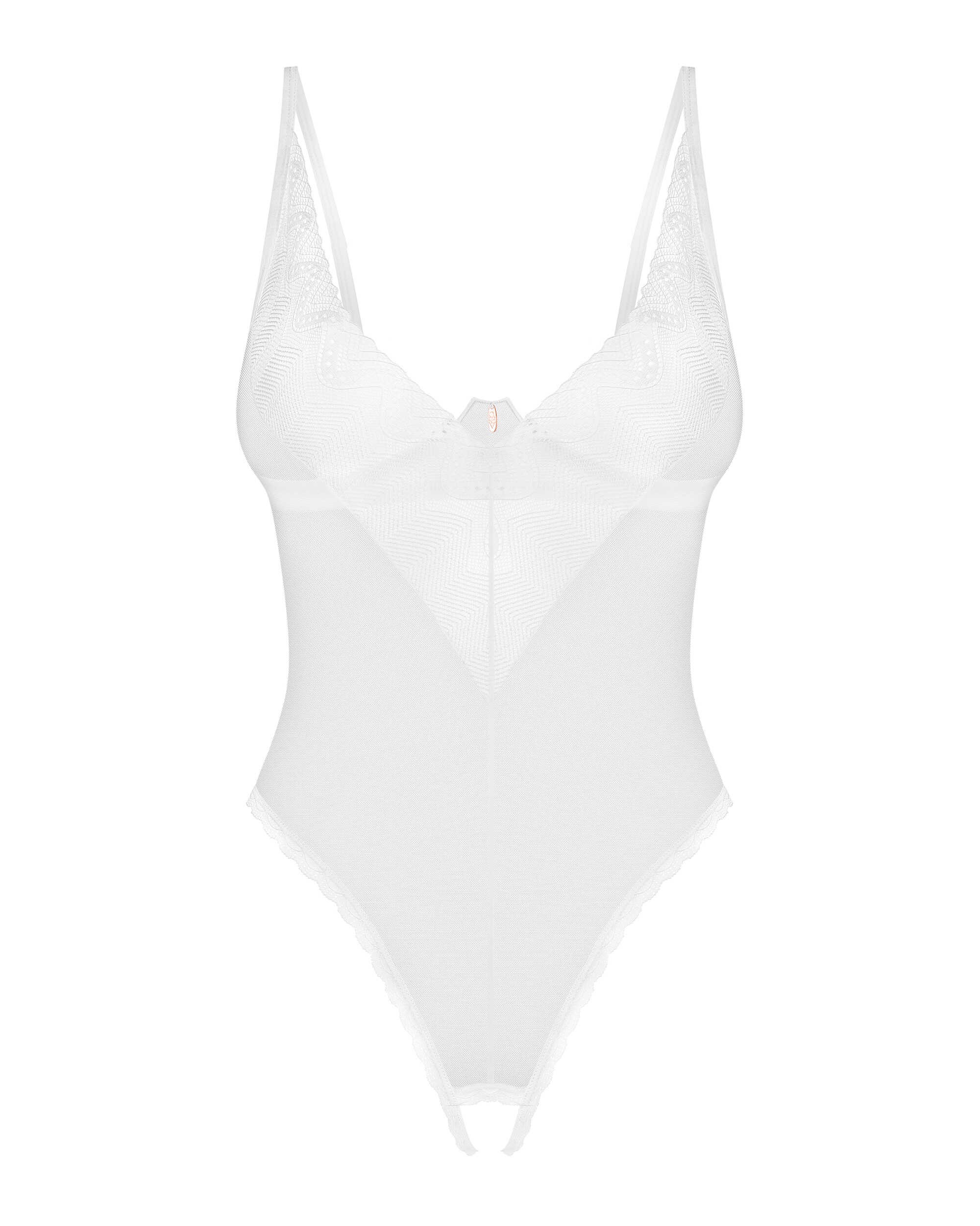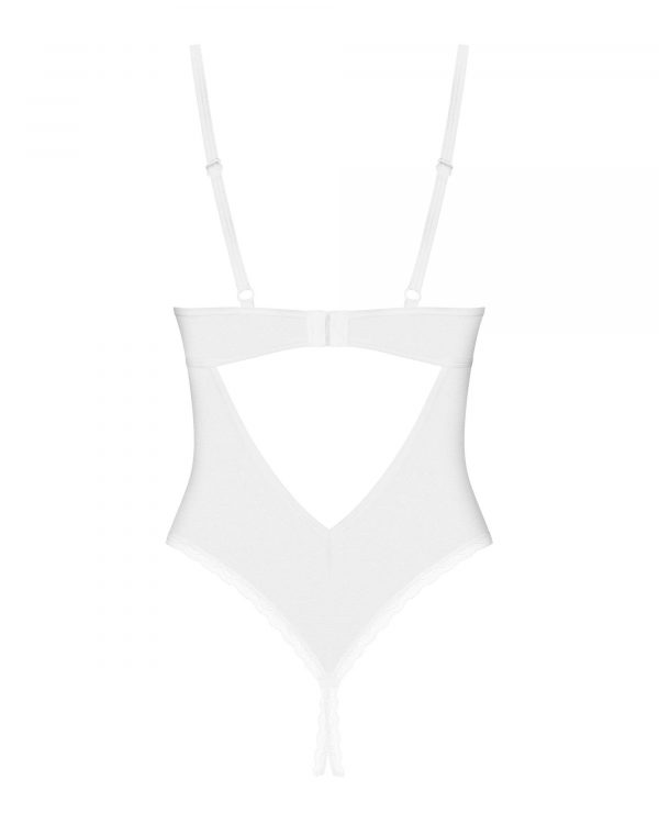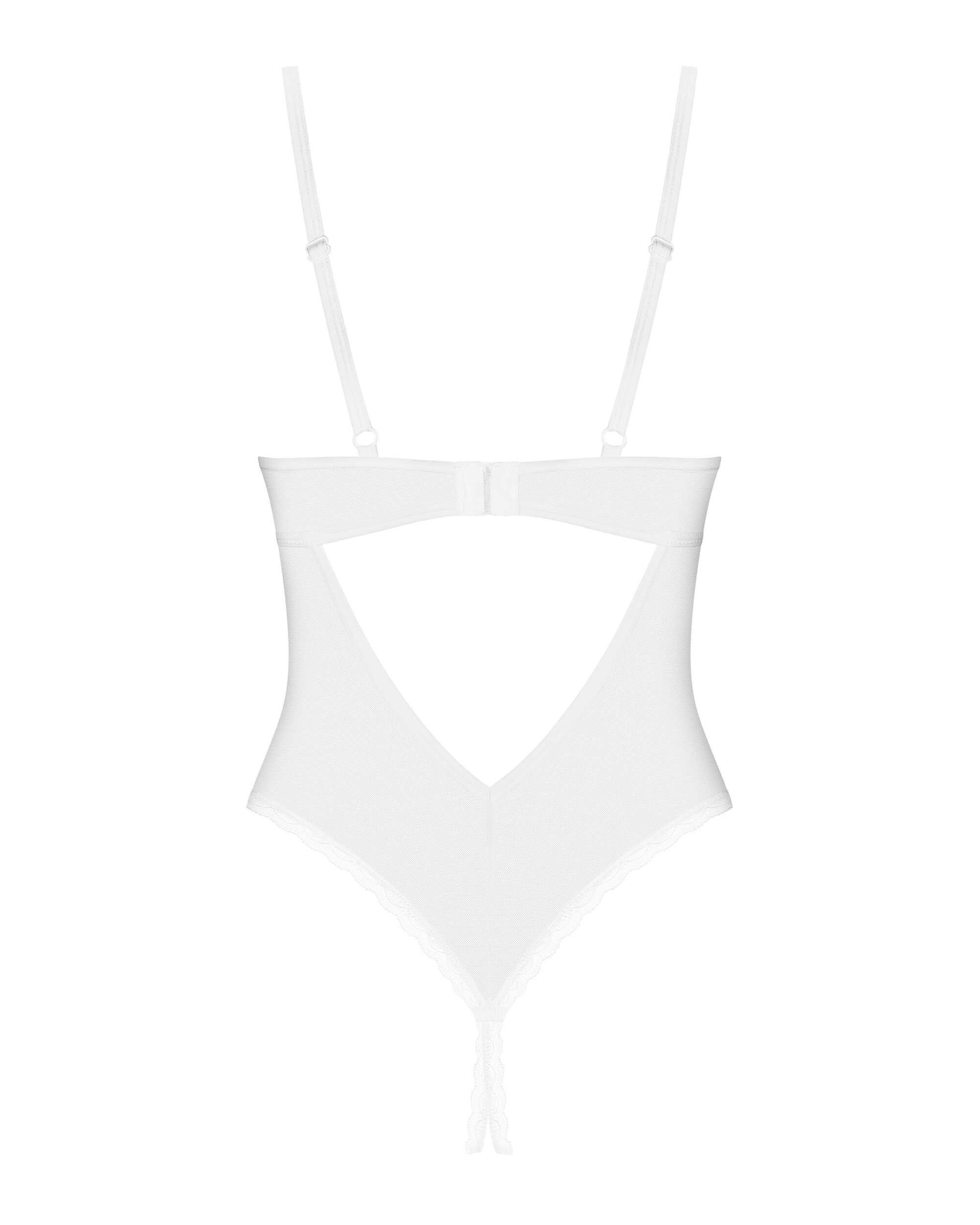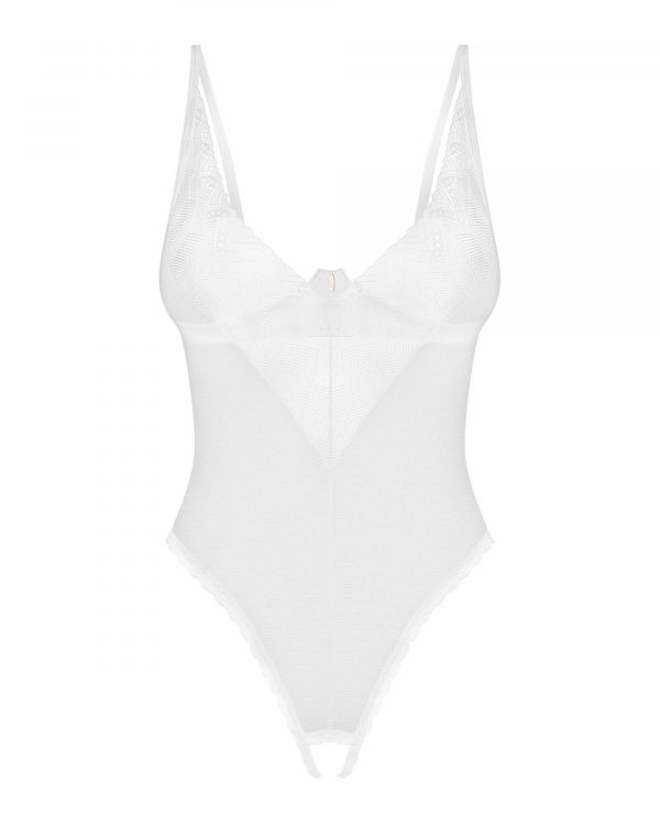 Body ouvert Alissium Un body blanc neige sexy avec un entrejambe ouvert. La forme minimaliste combinée à des accessoires subtils mettra en valeur vos courbes féminines. Une idée parfaite pour des occasions romantiques qui vous laisseront tous les deux enchantés! – body blanc avec entrejambe ouverte- décolleté profond- armatures en bonnets souples – matériel transparent – dentelle à motif géométrique- pendentif en or rose- 94 % polyamide, 6 % élasthanne- conçus dans l?UE- sans nickel