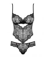 Un délice pour les yeux et pour celle qui le portera. Un body noir sexy en dentelle avec une coupe très originale. Mise en valeur de la poitrine avec des bonnets à armatures et des bretelles réglables. Une coupe triangulaire qui donne un effet amincissant et qui vient rejoindre la partie string. Fermeture dans le dos avec un laçage façon corset et qui donne un look ensemble sexy. La dentelle est à motif florale et la composition est 90% polyamide et 10% elasthanne.Découvrir toute la collection de lingerie sexy Alluria Obsessive