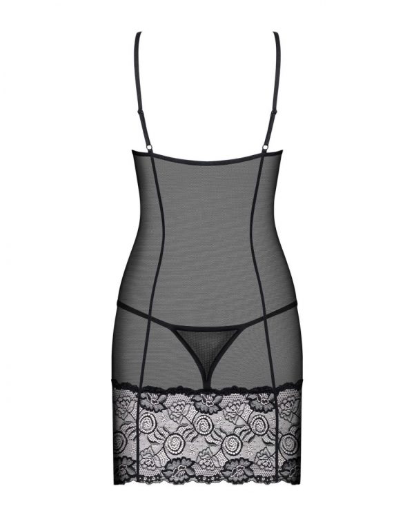 Une nuisette sexy noire qui sera un véritable atout de charme. Dans un tissu transparent avec 2 lignes qui affinent la silhouette et avec la partie poitrine et le bas de la nuisette dans une fine dentelle, la chaleur ne pourra que monter. Joli décolleté et poitrine avec armatures pour un confort parfait, bretelles réglables et string inclus. Cette nuisette est composée de 94% Polyamide, 6% ElasthanneDécouvrir toute la collection de lingerie sexy Alluria Obsessive