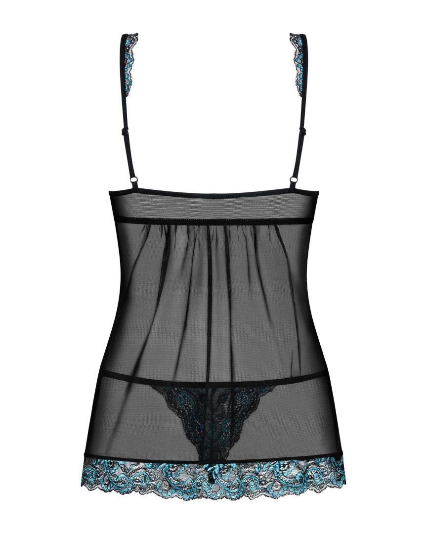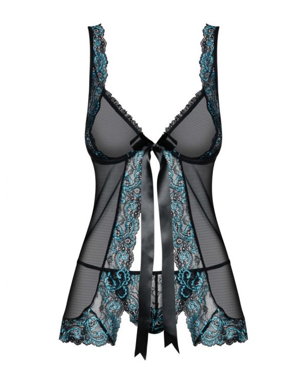 Ornée d’une délicate dentelle turquoise, la babydoll Amanta est une ode à la sensualité.À la fois sexy et élégant, ce modèle de la marque Obsessive dévoile subtilement chaque courbe féminine, rendant ainsi votre silhouette absolument exquise.Avec une lingerie pareille, vous ne pouvez être que parfaite ! Nous n’avez qu’à l’enfiler et laisser la magie opérer… Composition : 94% polyamide, 6% élasthanne.