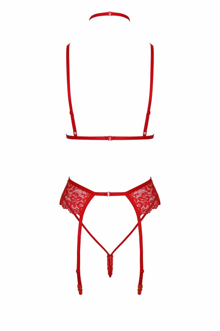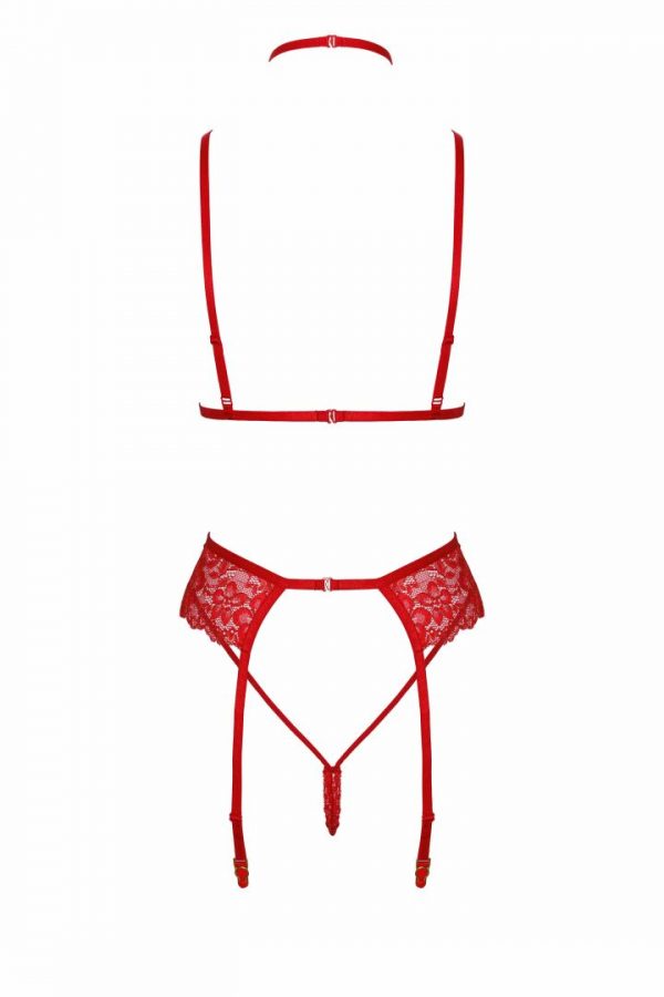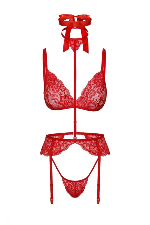 Bondage ensemble rouge en dentelle avec soutien-gorge, culotte, porte-jarretelles, collier et ruban.Lace: 90%Poliammide, 10%Elastan