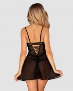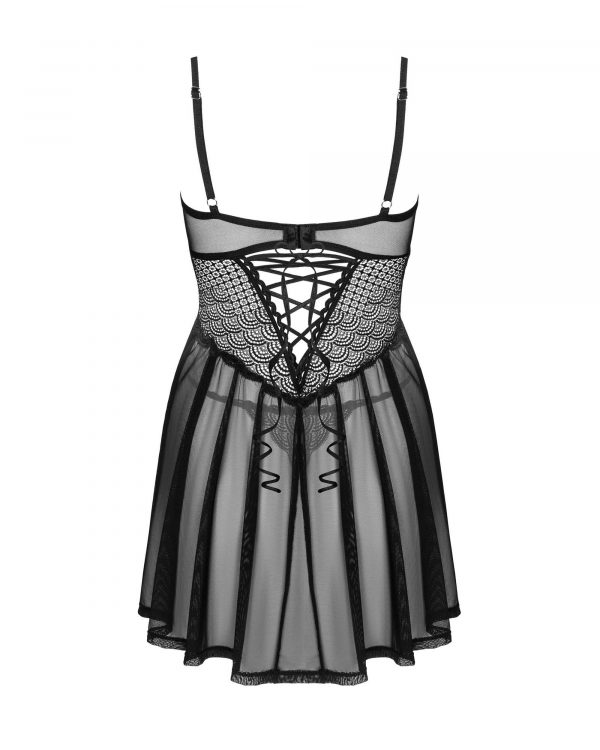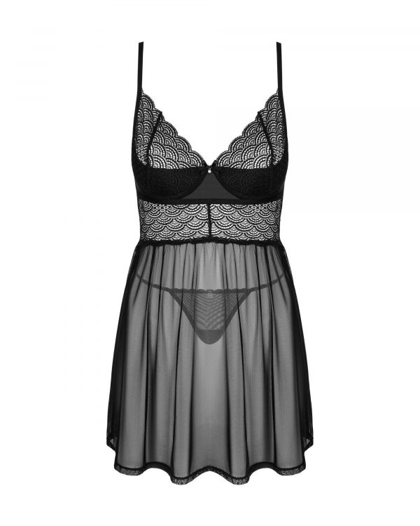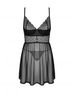Nuisette et string Chemeris Nuisette et string noirs transparentsVous prévoyez un rendez-vous spécial ? Vous voulez créer une atmosphère romantique tout en ajoutant du piquant à votre chambre ? La nuisette de la collection Chemeris est un superbe choix ! Un tissu aéré et transparent combiné à des motifs subtils est une combinaison accrocheuse. De plus, le laçage réglable dans le dos accentue de manière tentante la taille et assure le confort. N’hésitez plus et offrez-vous le luxe ! Regardez les détails : ? Nuisette et string Chemeris noirs ? laçage réglable au dos, bretelles et fermeture à plusieurs niveaux ? garantie d’un ajustement parfait ? bonnets rembourrés et à armatures ? accentuation parfaite de la poitrine ? des décorations en dentelle uniques – attirent l’attention ? tissu transparent à haute élasticité ? assure votre confort (babydoll : 94% polyamide, 6% élasthanne ; string : 90% polyamide, 10% élasthanne)