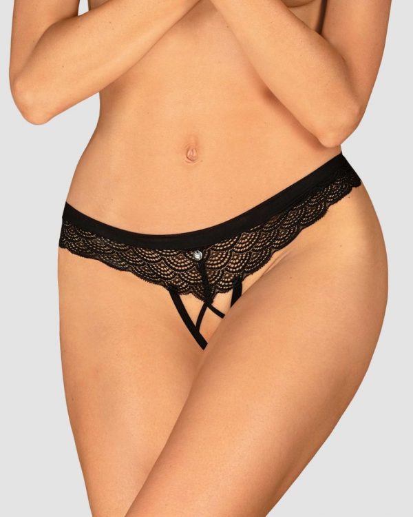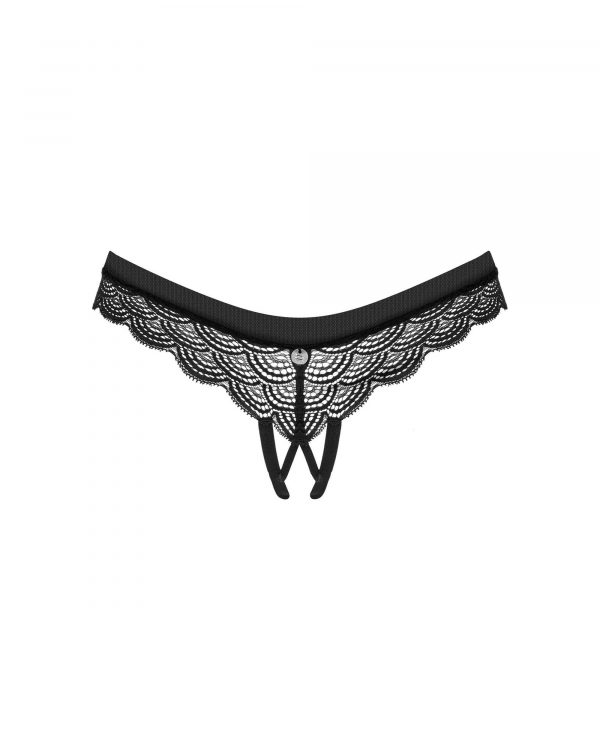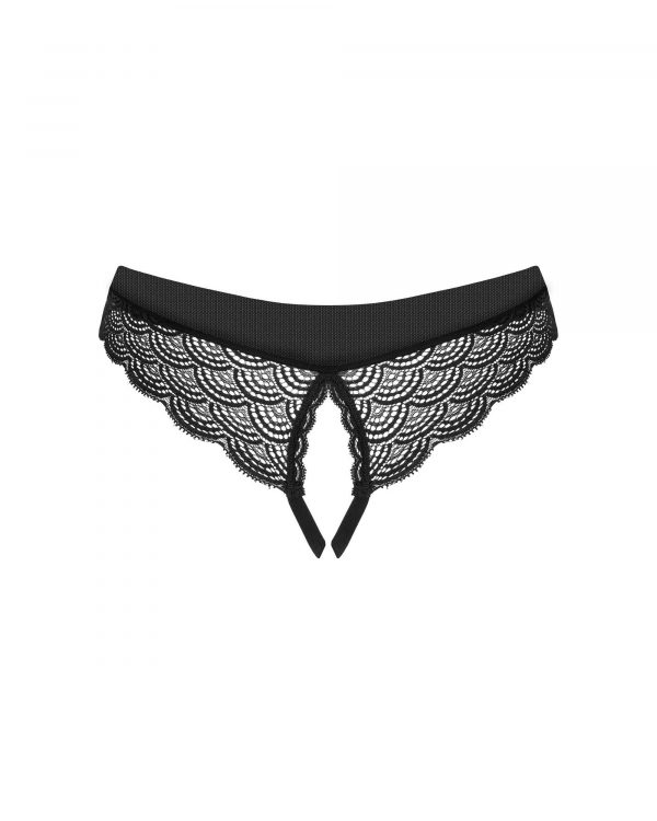 Culotte entrejambe ChemerisCulotte en dentelle sans entrejambeVoulez-vous impressionner votre prochaine date? Accentuer votre féminité d?une manière extrêmement subtile! Mettez la culotte Chemeris en noir intemporel et sentez-vous irrésistiblement attrayant. Forme minimaliste, dentelle unique, avec une coupe alléchante mettant l?accent sur la derriere, et un entrejambe ouvert qui ajoute du piquant ? une garantie de moments inoubliables pleins de tendresse. Choisissez de nouvelles expériences et préparez-vous à une vague de plaisir!Voyez pourquoi ils sont si spéciaux : ? Culotte Chemeris en noir ? coupe ouverte ? design tentant ? dentelle à motif géométrique ? pour attirer l?attention ? pendentif en argent ? un détail chic ? tissu doux au toucher ? assure un sentiment de confort (90 % polyamide, 10 % élasthanne)