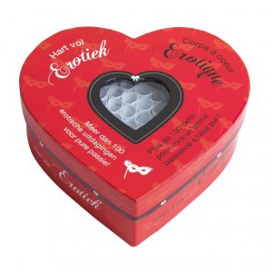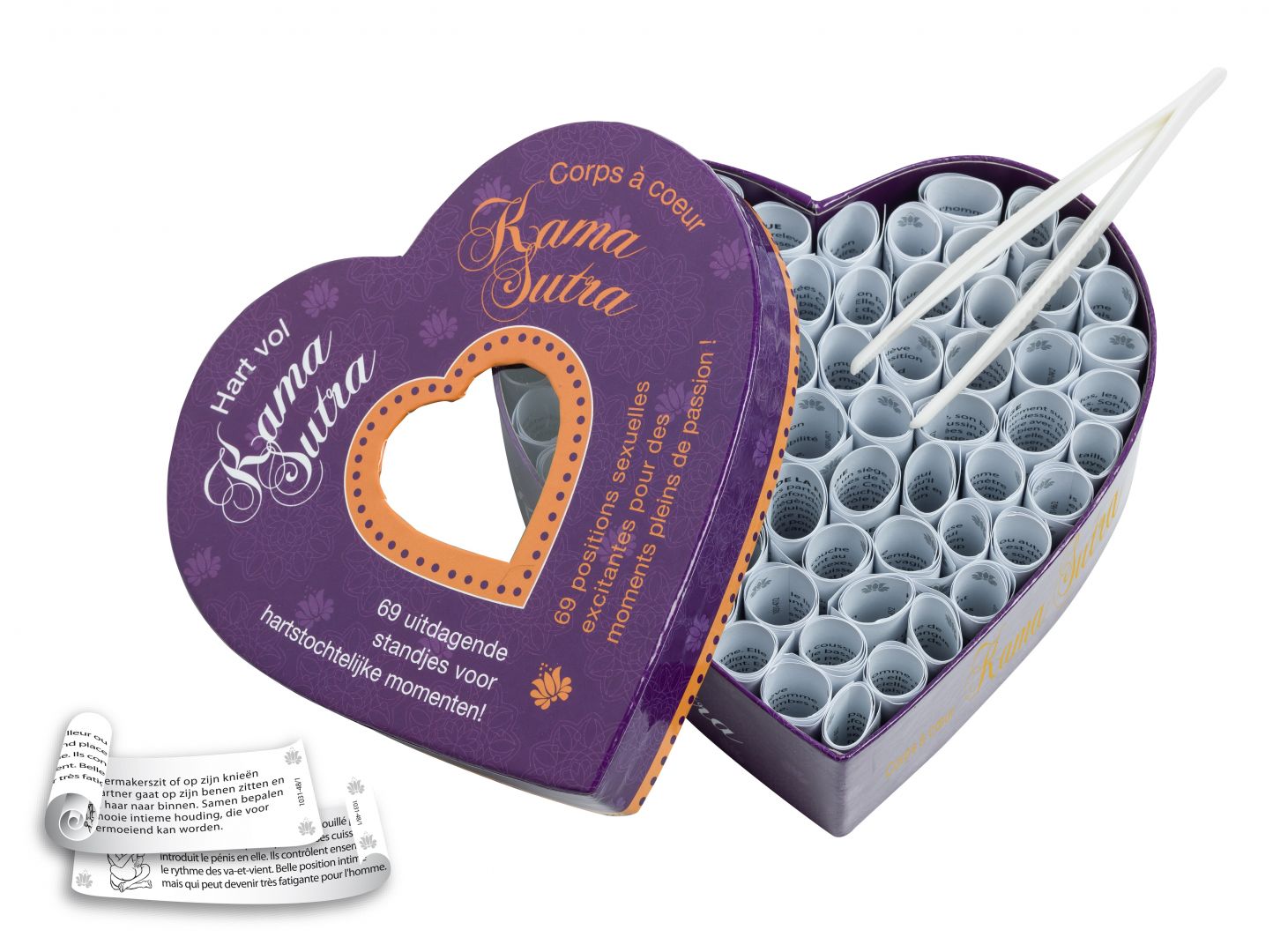Des sensations multiples pour vous et votre partenaire ! Prenez, à l?aide d?une pincette, un petit rouleau dans la boîte en forme de coeur corps à coeur Kama sutra. Quelle position érotique allez-vous adopter ensemble ?La balançoire, le phénix dans la joie ou encore l?union de la vache ? Relevez le défi et amusez-vous tout en partageant des moments de grande intimité.Le corps à coeur Kama Sutra contient 69 positions pour la plupart tirées du séculaire Kama Sutra indien ; la science orientale de l?amour. Le Kama Sutra fait une large place au respect réciproque. Découvrez en jouant les positions qui vous conviennent le mieux.Diverses variantes romantiques et érotiques sont disponibles dans cette série de coeurs.Explications en vidéo du corps à coeur Kamasutra.