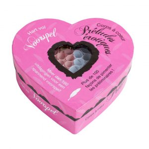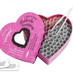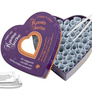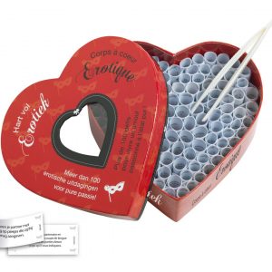 Des sensations multiples pour vous et votre partenaire ! Prenez, à l?aide d?une pincette, un petit rouleau dans la boîte en forme de coeur corps à coeur Kama sutra. Quelle position érotique allez-vous adopter ensemble ?La balançoire, le phénix dans la joie ou encore l?union de la vache ? Relevez le défi et amusez-vous tout en partageant des moments de grande intimité.Le corps à coeur Kama Sutra contient 69 positions pour la plupart tirées du séculaire Kama Sutra indien ; la science orientale de l?amour. Le Kama Sutra fait une large place au respect réciproque. Découvrez en jouant les positions qui vous conviennent le mieux.Diverses variantes romantiques et érotiques sont disponibles dans cette série de coeurs.Explications en vidéo du corps à coeur Kamasutra.