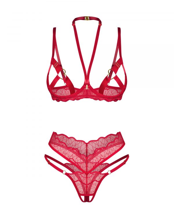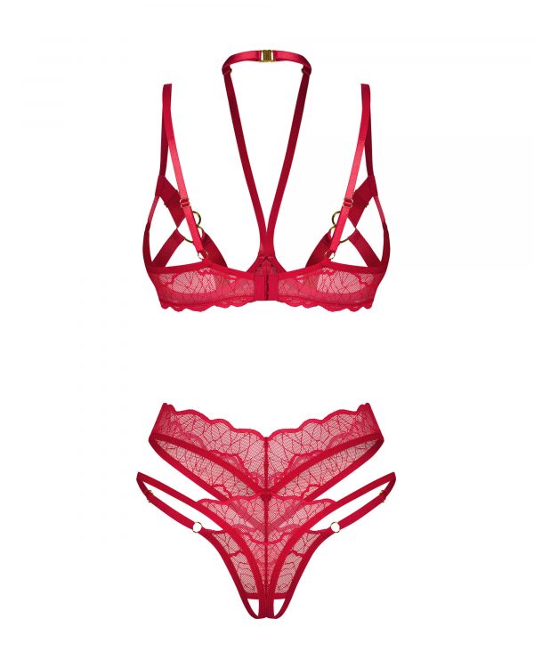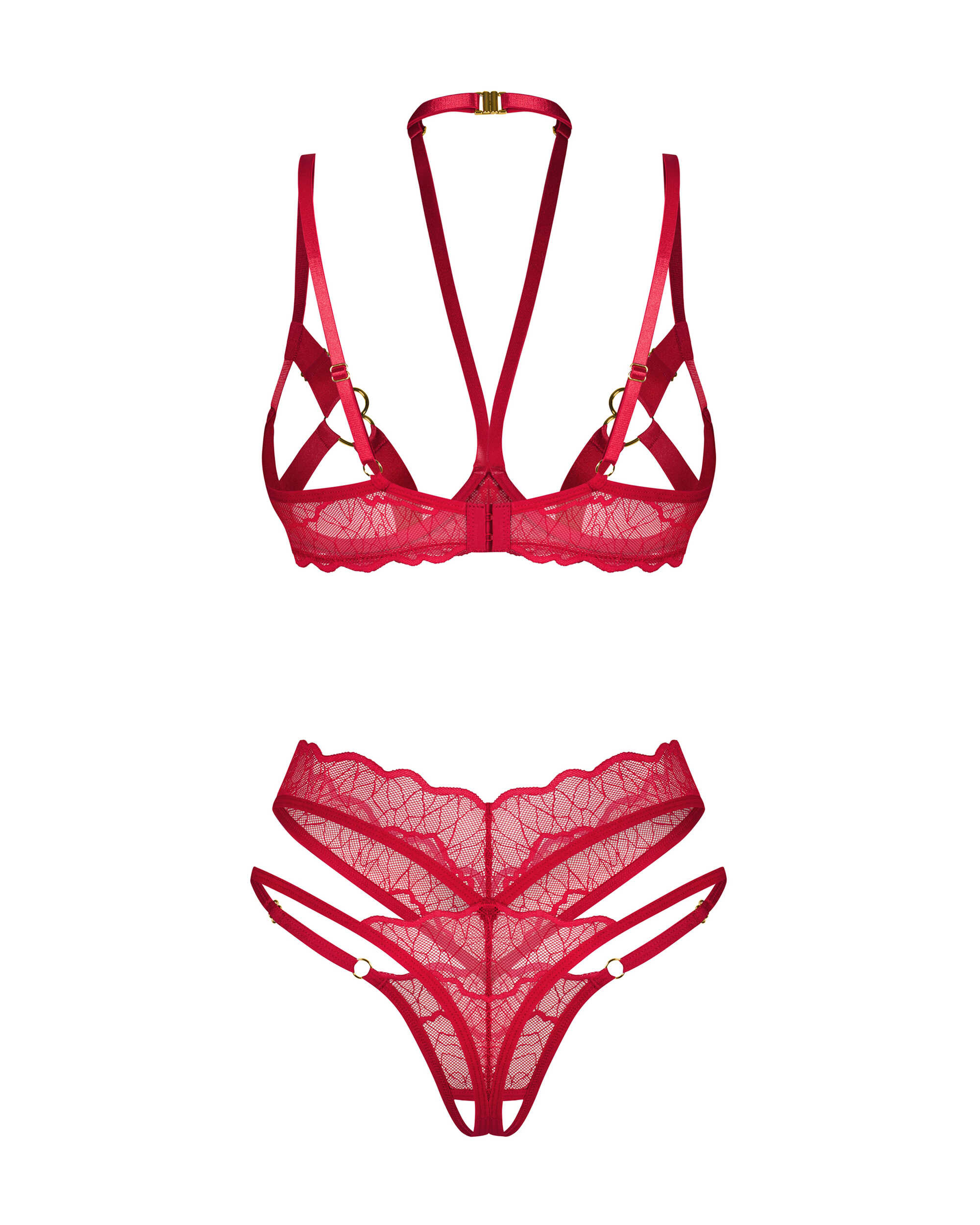 Cupide Desir Ensemble ouvert 2 pièces Parfait pour un look audacieux, cet ensemble de lingerie rouge est doté d?un soutien-gorge ouvert et d?un string ouvert assorti. Bretelles élastiques, dentelle délicate et accents dorés étincelants ajoutent une touche élégante. Avec ses bretelles larges et réglables et sa fermeture multi-crochet sécurisée, cet ensemble offre à la fois confort et charme. – Ensemble de 2 pièces ouvert ? soutien-gorge et string – conception ouverte- gobelets exposés- tissus doux au toucher- sangles réglables- accents dorés en forme de c?ur- pendentif ovale- fermeture arrière- Tissu : 90% polyamide, 10% élasthanne- Conçu dans l?UE