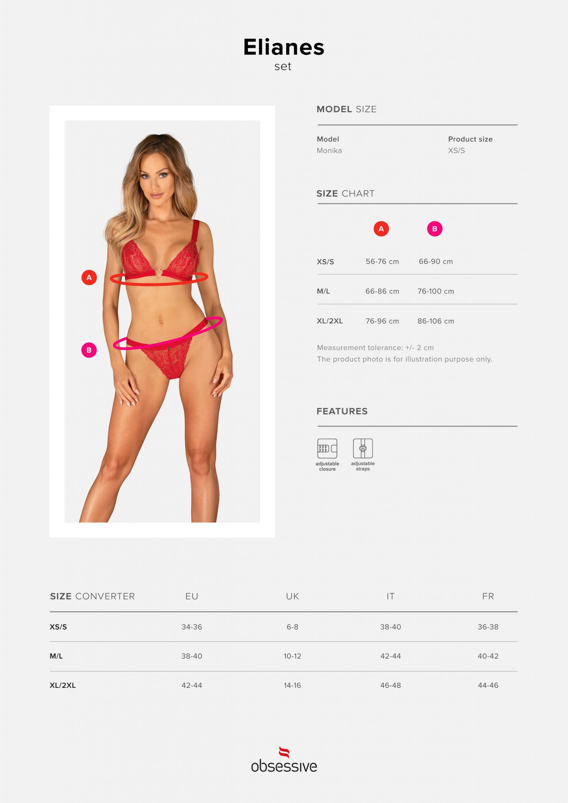 Ensemble 2 pièces ElianesVous recherchez quelque chose de délicat et de puissamment féminin ? Laissez-vous charmer par cette lingerie rouge ! Ajoutez du sex-appeal et devenez une source subtile de chaleur irrésistible dans votre chambre! Regardez les finitions élégantes en dentelle qui mettront merveilleusement en valeur votre beauté. Profitez des moments ensemble et laissez-vous emporter par le plaisir.Pour en savoir plus :- un ensemble rouge ? string et soutien-gorge- excellent ajustement grâce aux sangles réglables et à la fixation en plusieurs étapes- bordure en dentelle séduisante- connecteur métallique en forme de c?ur doré ? un détail intrigant- pendentif brillant ? un ajout subtil- doux au toucher ? procure une sensation de confort (90 % polyamide, 10 % élasthanne)