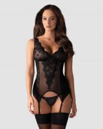 Guêpière féminine avec jarretières décorées d’un ornement floral. Velours floral et doux au milieu du ventre et sur la poitrine. Dentelle noire sur le haut de la poitrine. Bretelles réglables. Cette guepiere noire s’adapte à la silhouette grâce à un lacet dans le dos ! L’arrière est lisse et subtil d’une maille transparente. Un string décoré en dentelle et velours est inclus.Composition : 94% Polyamide, 6% Élasthanne