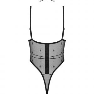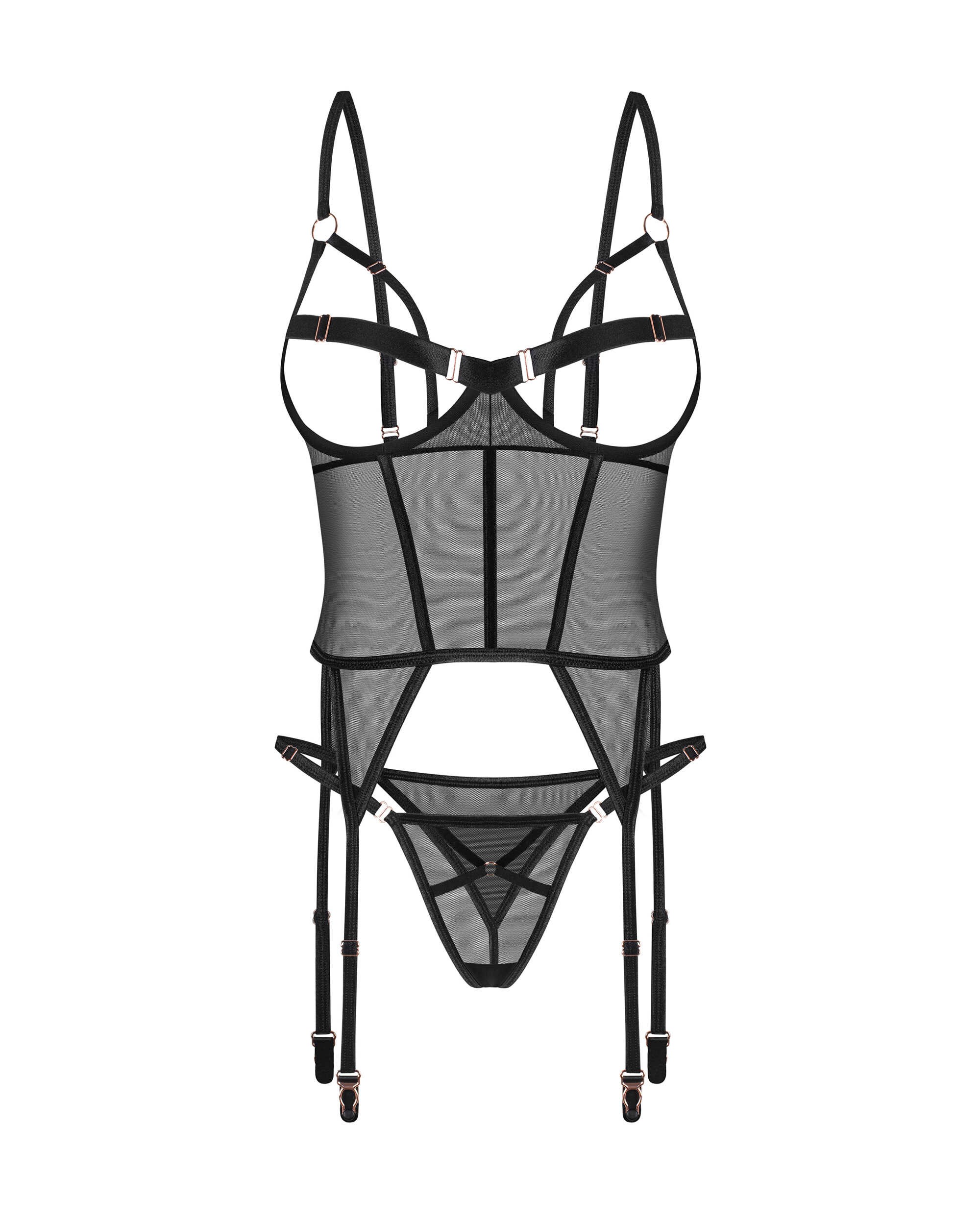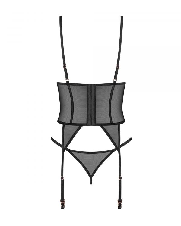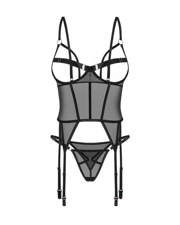 Euridia corset et stringAudacieux et sans complexe, mais aussi doux et souple. Un duo stimulant, conçu pour redéfinir la sophistication. Une confiance sans effort dans le style, infusé d?une allure audacieuse et alléchante.Un corset noir avec une coupe moderne en maille douce et flexible pour un confort et un style personnalisés. Des bretelles réglables et une fermeture à l?arrière assurent un ajustement parfait. De subtils accessoires en métal rose doré complètent l?ensemble. Complet avec string décoratif avec une taille réglable. ? corset et string noirs? tasses ouvertes? bretelles et corset ajustables? détails en or rose? tissus de la plus haute qualité? conçu dans l?UE? 94 % polyamide, 6 % élasthanne