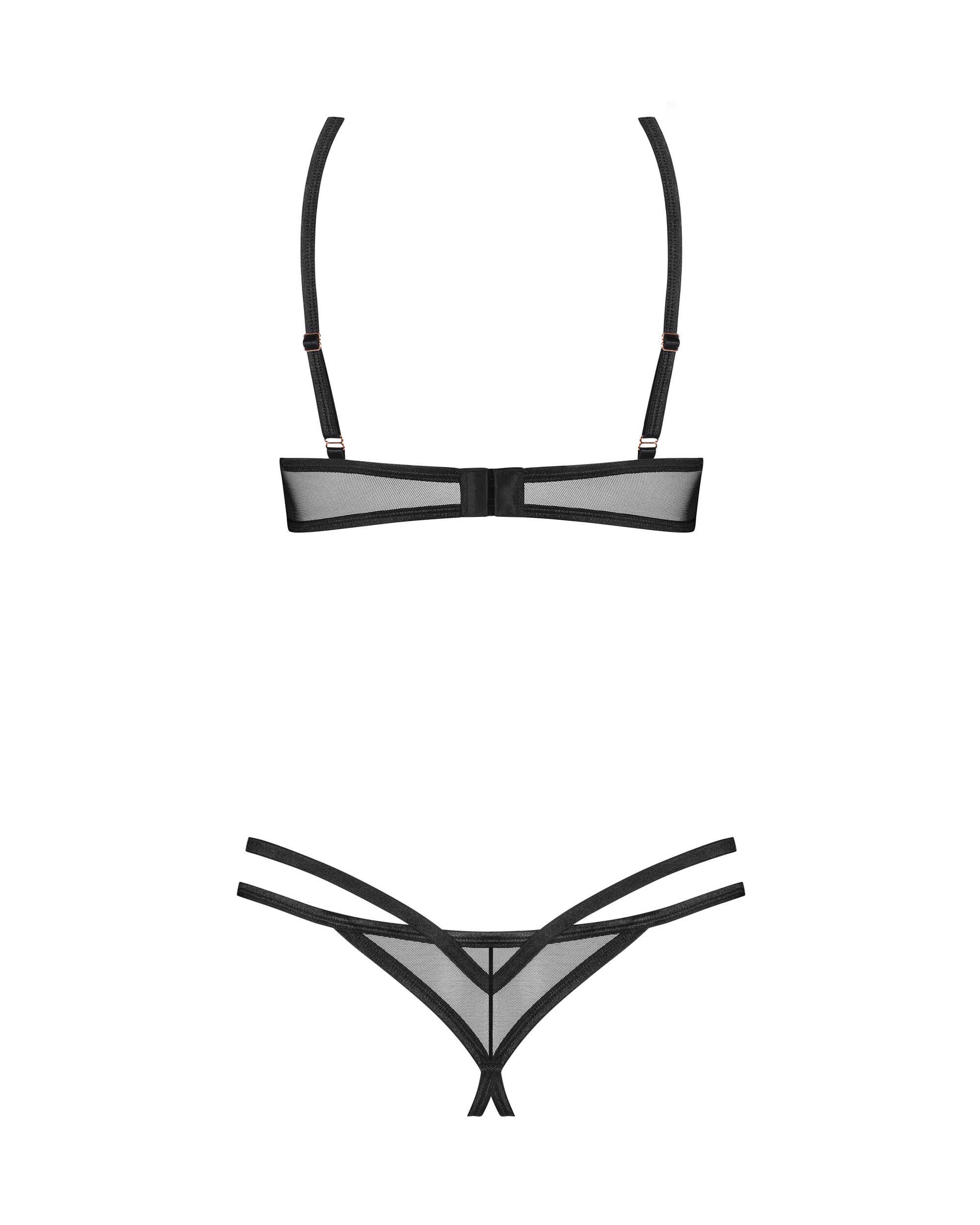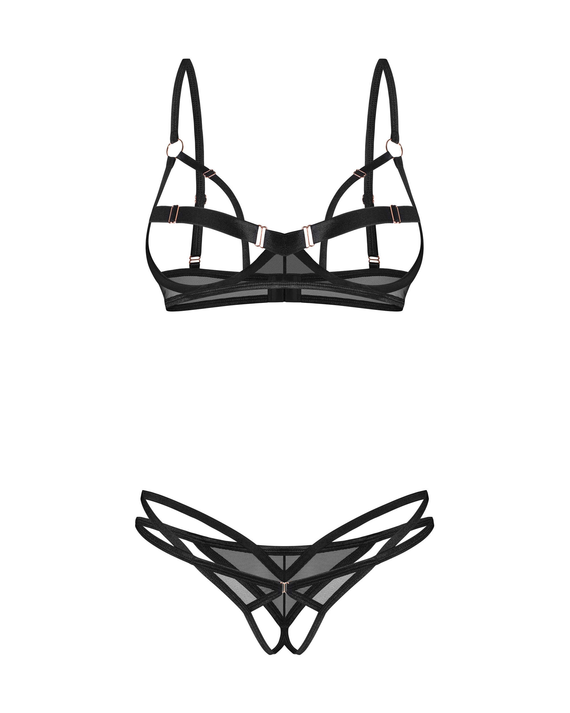 Soutien-gorge ouvert Euridia Un mélange de design ouvert et de style contemporain qui laisse peu de place à l?imagination. Défie les conventions, offrant une allure audacieusement révélatrice. Embrassez et explorez la liberté d?une sensualité audacieuse. Le soutien-gorge combine un design classique avec des détails modernes. Un design ouvert [quart de poitrine] en noir, décoré d?accessoires métalliques délicats dans une nuance d?or rose. Avec des longueurs de sangle réglables et un ajustement personnalisable assuré par une fermeture à crochet et à ?il, ce soutien-gorge promet à la fois confort et confiance. ? Soutien-gorge Euridia? poitrine ouvertes? à armature? fermeture réglable à l?arrière? bretelles ajustables? Accessoires rose doré? conçu dans l?UE? 94 % polyamide, 6 % élasthanne String ouvert Euridia De nouveaux sommets de sophistication. Une pièce audacieuse, conçue pour élever la tentation avec sa torsion de style ouvert. Amplifiez-le et célébrez votre liberté pour mettre en valeur votre individualité unique. Lanières noires modernes, avec un design unique et des tissus élastiques de haute qualité, pour le confort ultime pendant l?usage. La combinaison de maille de haute qualité et de lanières doubles garantit un ajustement parfait. Un subtil accent en métal doré rose orne le devant. ? String noir Euridia? entrejambe ouvert? Rose dorée? Intégration de lanières élastiques et de tissu transparent? matériau extensible? conçu dans l?UE? 94 % polyamide, 6 % élasthanne