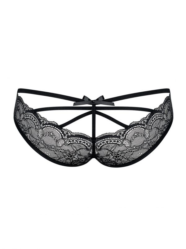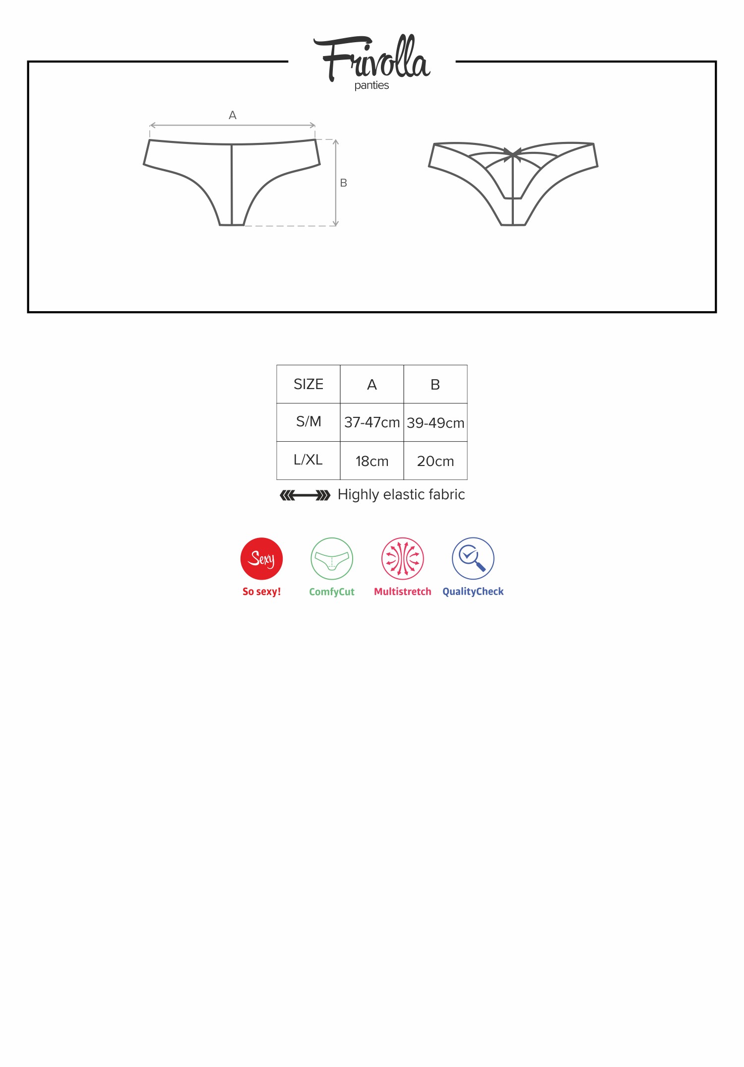 Une bien jolie et originale culotte coquine d’une sublime dentelle. Fine et sexy sur l’avant tandis que l’arrière plonge sur les fesses qui sont décorées d’ornements élastiques originaux et très confortables.Composition : 90% polyamide, 10% élasthanneDécouvrir toute la collection Frivolla Obsessive