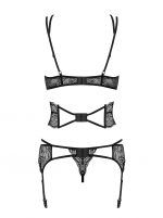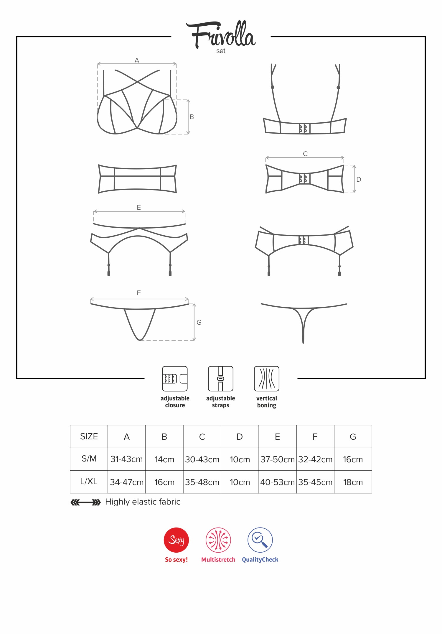 Voici un étonnant ensemble sexy noir de 4 pièces. Un soutien-gorge de dentelle avec bretelles et attache dos réglables, poitrine décorée d’ornements élastiques. Une ceinture de dentelle qui habille le corps avec fermeture réglables. Un porte-jarretelles de dentelle réglable ainsi que ses jarretelles et un string dentelle assorti. LaComposition : 90% polyamide, 10% élasthanneDécouvrir toute la collection Frivolla Obsessive