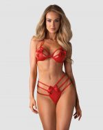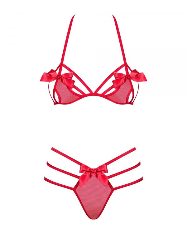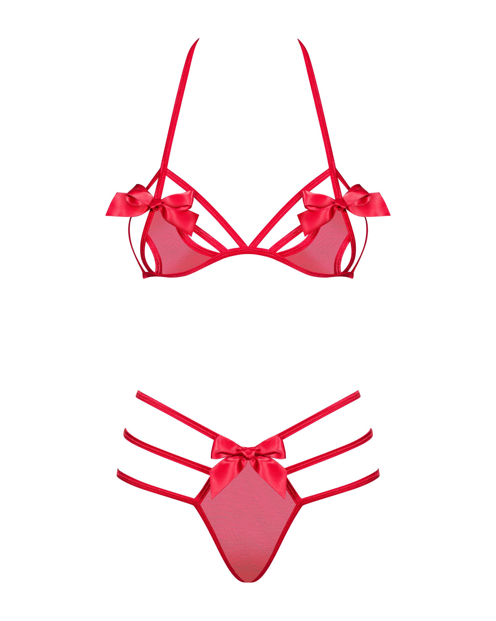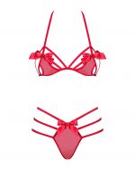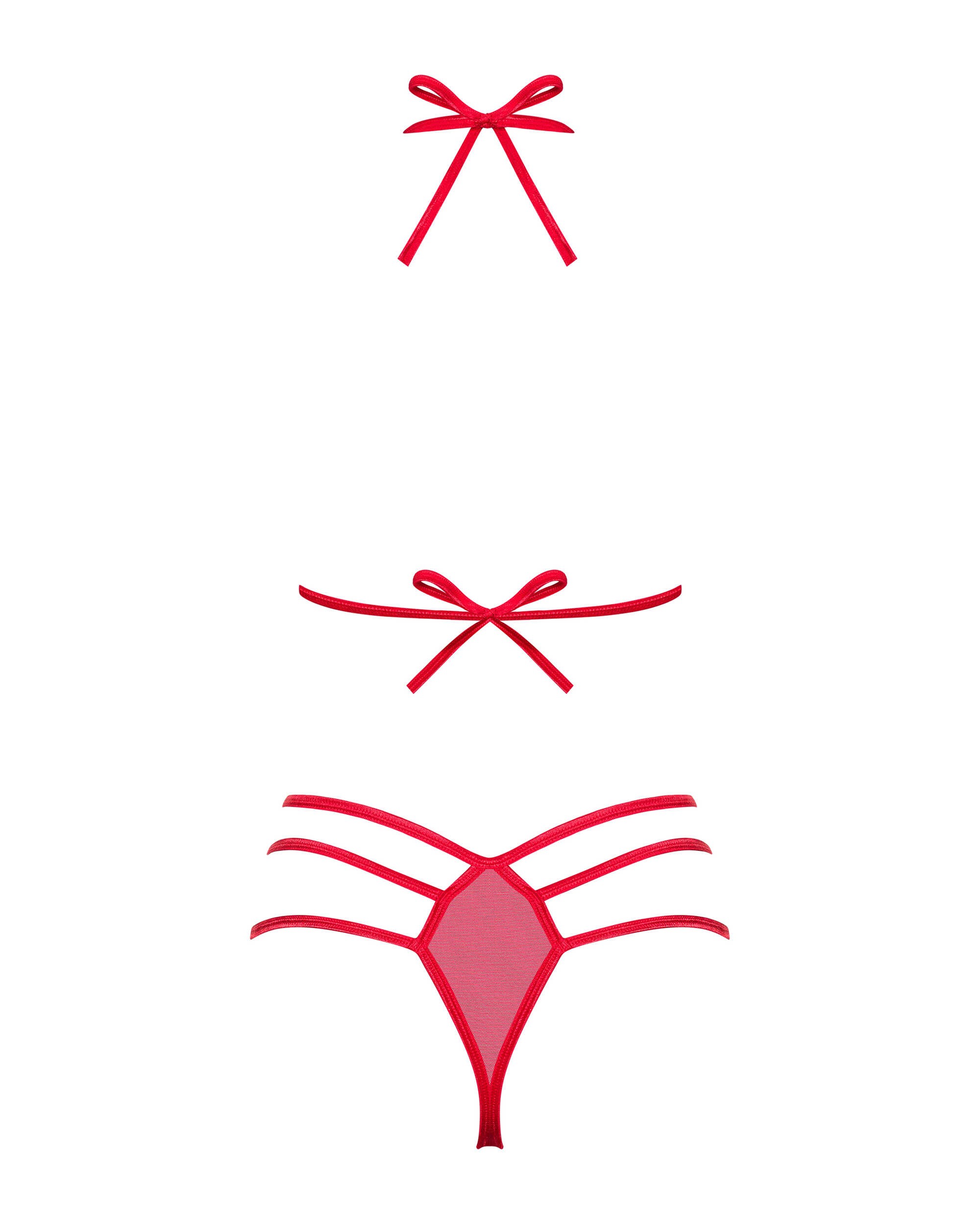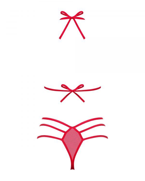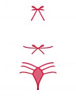 Envie d?un cadeau ? L?ensemble Giftella comblera les plus exigeantes : rouge glamour, détail coquin, découpes et lanières tendances et ultra sexy. N’oubliez pas de commander les bas S308 assortis pour un look irrésistible.Finalement c?est peut-être vous le cadeau ! Gageons qu?il saura l?apprécier?Ensemble 2 pièces original et glamourSoutien-gorge dos nuRéglable autour du cou et au dos – ajustement parfaitString à lanières, vos courbes sont encore plus sexyBonnets découpés à lanières ? votre poitrine est découverte et magnifiée3 petits n?uds pour souligner les points stratégiquesL?ensemble comprend un soutien-gorge et un stringBas non inclus – nous recommandons les bas autoportants S808Maille douce et lanières élastiques Composition : 94% polyamide, 6% élasthanne