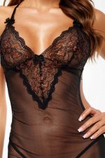 Une chemise classique, sexy, noire en tulle et dentelle avec un accent de cuivre. Les tasses triangulaires soulignent magnifiquement le buste. La chemise présente des bretelles qui se croisent élégamment dans le dos.Inclus dans l?ensemble sont des culottes string avec un motif de dentelle répétée.Taille : S/M et L/XLTaille S/M : (Seins : 81-91 cm, B-C, Taille : 56-71 cm, Hanche : 85-97 cm)Taille L/XL : (Seins : 91-107 cm, C-D, Taille : 71-91 cm, Hanche : 97-112 cm)Matière : 50% polyester, 47% polyamide, 3% élasthanne