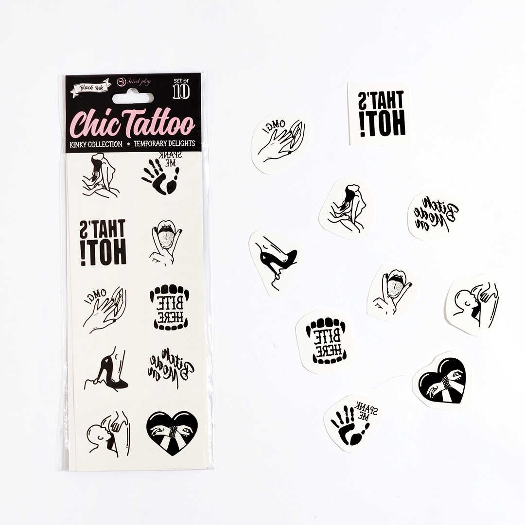 Vous aimez les tatouages ??mais avez-vous peur de les regretter à l?avenir? Voilà! Nous avons la solution. Chic Tattoo est une collection de tatouages ??temporaires que vous ne regretterez jamais. Utilisez-les comme et quand vous le souhaitez, pour les montrer lors de vos festivals préférés ou lors de soirées tant désirées. Ses designs attrayants sont idéaux pour flirter et séduire. Ou tout simplement pour passer un bon moment et emporter avec vous ces tatouages ??réindicatifs et suggestifs. Contenu: Comprend 10 tatouages ??temporaires. Kinky Collection Mode d’utilisation: La peau doit être complètement propre et sèche. Découpez le dessin désiré dans la feuille et retirez le papier transparent. Placez le tatouage face bas sur la peau. Frottez fermement le dos du tatouage avec un chiffon ou une éponge humide pendant 10 à 20 secondes et soulevez délicatement un coin du tatouage pour vérifier s’il se transfère bien. S’il a été transféré, décollez doucement le papier. Sinon, appuyez sur le papier et humidifiez-le à nouveau. Après avoir enlevé le papier, séchez le tatouage en tapotant. Si on le soigne bien, il durera plusieurs jours (3-7 jours). Utilisez de l’huile d’olive pour éliminer le tatouage.