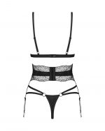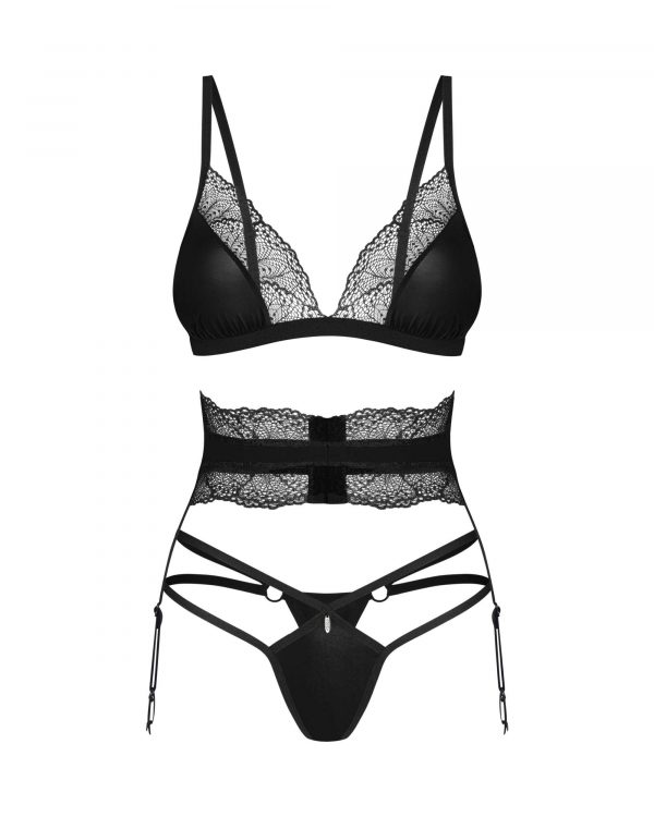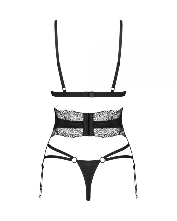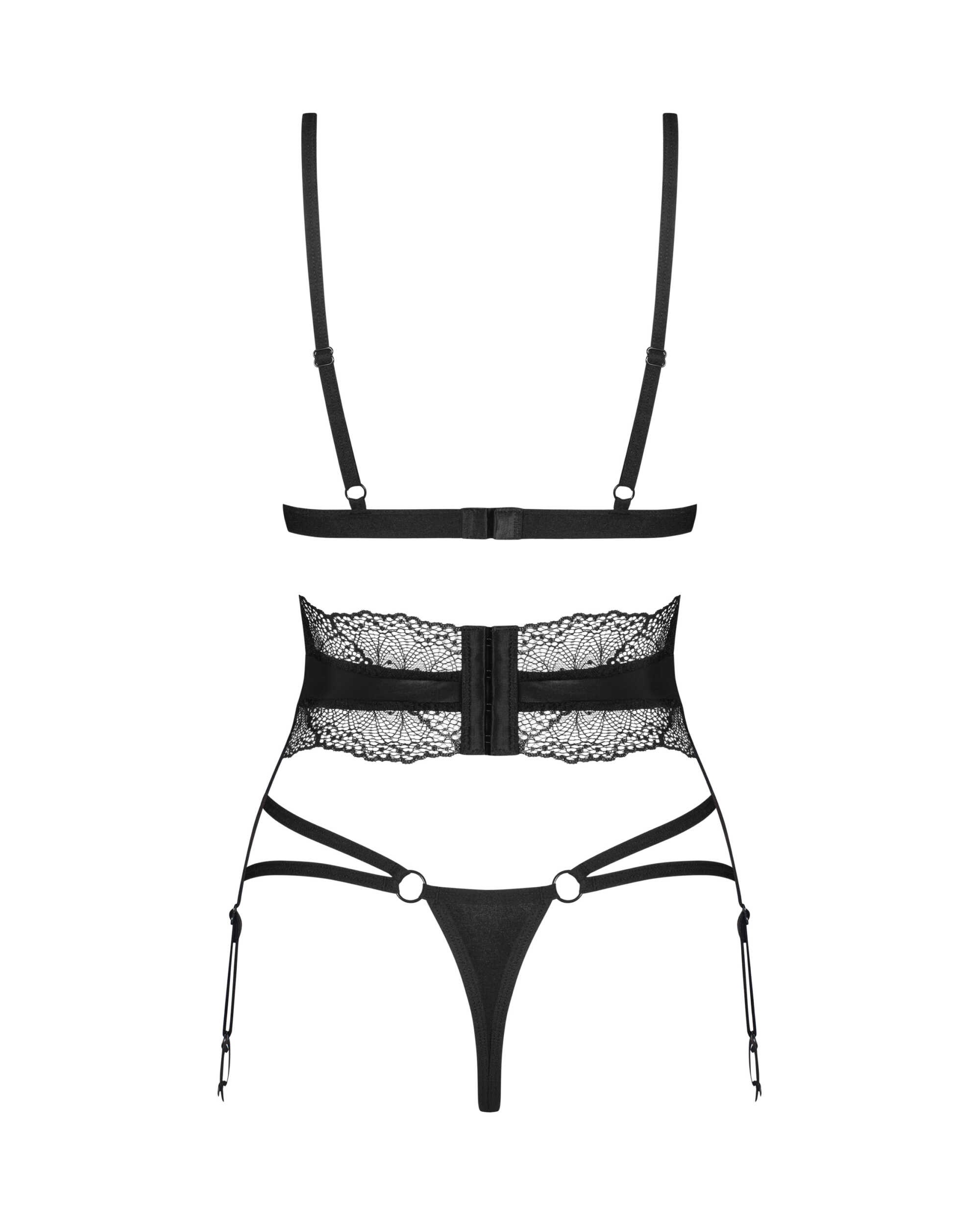 Ensemble 3 pièces LobellisSavourez le trio Lobellis : soutien-gorge, porte-jarretelles et string. Chaque pièce est méticuleusement travaillée, chaque détail considéré. L?union de la dentelle et du tissu noir forme une harmonie parfaite. Avec des crochets dans le dos, des bretelles réglables et des accents sensuels, le confort se marie parfaitement avec la séduction. – un ensemble composé d?un soutien-gorge, d?un porte-jarretelles et d?un string- tissu noir- dentelle unique- connecteurs en métal noir- bretelles et porte-jarretelles réglables- pendentif brillant- fermeture à crochet et à oeil à l?arrière- string et soutien-gorge (85% polyamide, 15% élasthanne); porte-jarretelles (90% polyamide, 10% élasthanne)- conçus dans l?UE- sans nickel