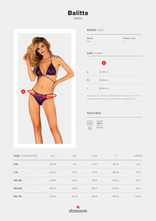 Maillot de bain Balitta De l’éclat, du chic et un design charmant ! Sautez dans le superbe bikini Balitta et profitez pleinement des plaisirs de vos vacances ! Des formes joliment mises en valeur et un bronzage ravissant seront au premier plan, et vous aurez l’impression d’avoir enfin trouvé le bikini parfait ! Voulez-vous découvrir par vous-même? Apprenez à connaître les détails de cet ensemble: – bikini Balitta super sexy : soutien-gorge et culotte inclus – tissu violet scintillant au soleil ? bronzage sublimé ! – bonnets de soutien-gorge triangulaires – beaux seins – bretelles asymétriques sous le soutien-gorge – mise en valeur subtile de la silhouette ! – col licou – garantie d’un ajustement parfait – double laçage au dos – coupe féminine, ajustable – une culotte ornée de deux lanières sur les hanches – un look fantastique ! – matière souple et agréable (82% polyamide, 18% élasthanne ; doublure : 95% polyester, 5% élasthanne)