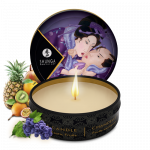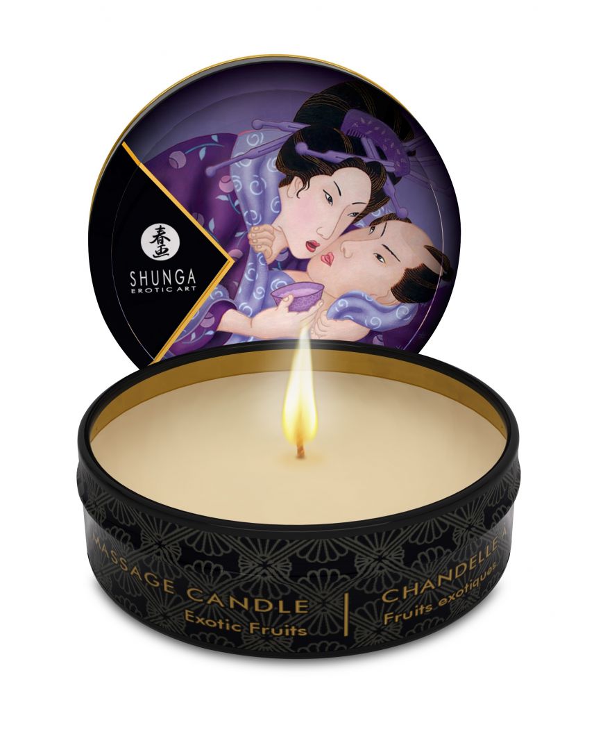 Avec cette mini bougie de massage au parfum de fruits exotiques, partagez un moment de bien-être et relaxation qui réchauffera l’ambiance et l’atmosphère.Allumez la bougie, attendez environ 20 minutes pour obtenir une quantité d’huile fondue suffisante pour un massage. Éteignez la flamme avant de verser l’huile dans la paume de la main.Composée d’huiles 100% naturellesProduit une huile tiède au toucherRend la peau douce et soyeuseExcellent émollientN’obstrue pas les poresUtilisable par les femmes enceintes, non comestibleFragrances délicates et subtiles de fruits exotiquesDurée 7 heures en moyenneContenance : 30 mlToujours garder la mèche coupée à 6 mmFabriquée au Canada Composition : Ingredients (I.N.C.I.): Hydrogenated Soybean Oil/Huile de soja hydrogénée, Coconut Oil/Huile de noix de coco (Cocos nucifera oil), Fragrance (Parfum), Sweet Almond Oil/Huile d’amande douce (Prunus amygdalus dulcis oil), Safflower Oil/Huile de carthame (Carthamus tinctorius oil), Avocado Oil/Huile d’avocat (Persea gratissima oil), Sesame Oil/Huile de sésame (Sesamun indicum oil), Grape Seed Oil/Huile de pépin de raisin (Vitis vinifera seed oil), Vitamin/Vitamine E (Tocopherol), Benzyl Alcohol, Cinnamyl Alcohol, Citral, Eugenol, Isoeugenol, Benzyl Salicylate, Cinnamal, Coumarin, D-Limonene, Geraniol, Benzyl Cinnamate, Lilial, Linalool, Benzyl Benzoate, Alpha Isomethyl Ionone