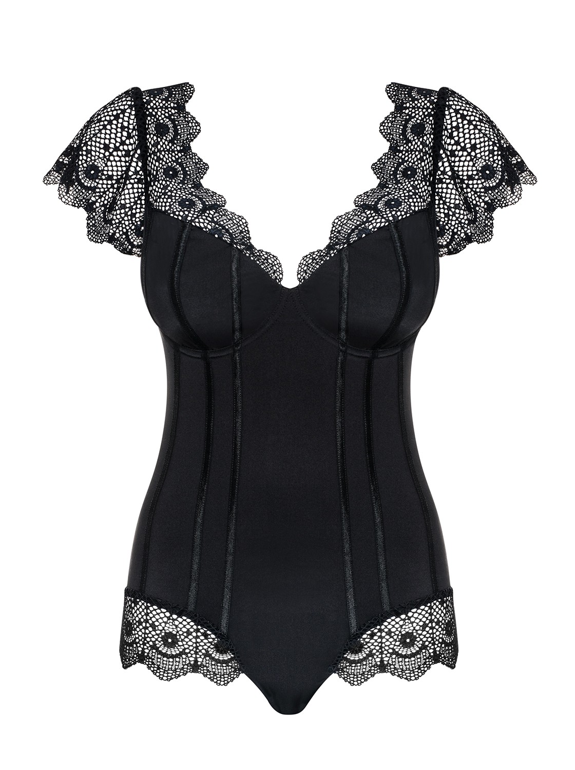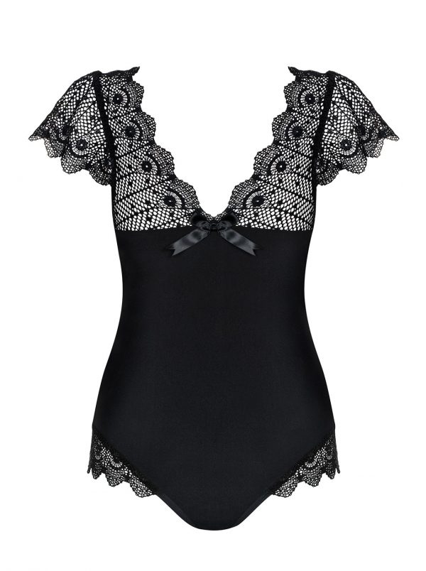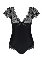 Super look pour ce body noir a décolleté avant et arrière. Ce body est avec armatures pour le confort et la beauté de la poitrine surmonté de dentelle élastique sur les épaules. Des lignes brillantes verticales viennent l’embellir et affiner la silhouette, l’entre-jambes s’ouvre et est réglables. Jolis volants de dentelle sur les cuisses. 85% polyamide 15% elasthanneDécouvrir toute la collection Moketta Obsessive