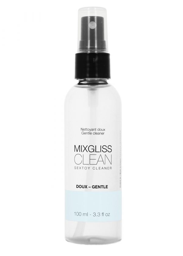 MIXGLISS CLEAN est un nettoyant sextoys à base d’eau, doux et fabriqué sous contrôle pharmaceutique, qui nettoie parfaitement vos jouets favoris tout en respectant leur matière et en préservant leur toucher, prolongeant ainsi leur durée de vie. Formulé sans alcool, ce nettoyant pour sextoys, sans colorant ni parabène, est compatible avec un usage corporel et convient aux peaux sensibles. Sans rinçage et en flacon spray, pour une utilisation et un dosage faciles, quelques vaporisations suffisent.Ce nettoyant pour jouets adultes est en flacon spray de 100 ml. SPÉCIFICATIONS TECHNIQUESPack : flacon PET + pompe spray + sleeveContenance : 100 mlFabriqué en FrancePrécautions : En cas de contact avec les yeux, rincer à l?eau. En cas de réaction allergique, arrêter l?utilisation. Tenir à l?abri de la lumière et de la chaleurLot : voir sous le flaconA utiliser dans les 12 mois après ouvertureLangues pack: FR, EN, AL, NL, ES, ITComposition : aqua, monopropylene glycol, benzalkonium chlorid, chlorhexidine, digluconate, allantoin, glycerin, stearamine, oxyd, cocamidopropylamine oxyd, parfum.