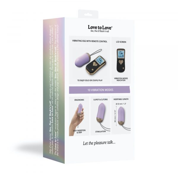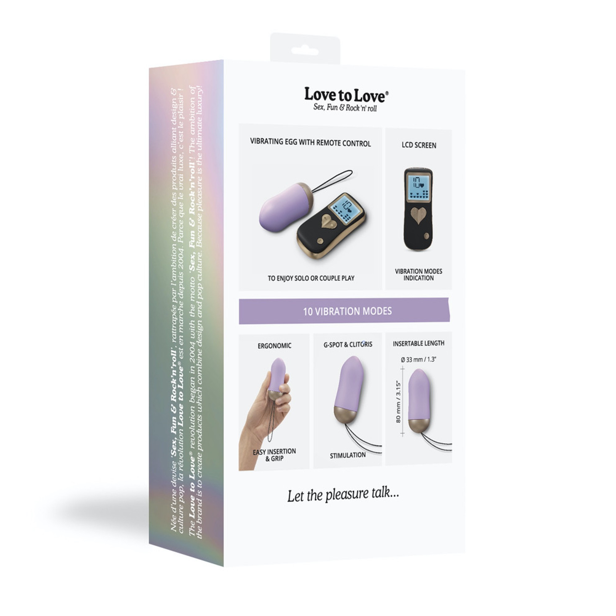 Commencez un jeu plus que coquin avec votre amoureux… et ressentez des sensations à distance ! Cet oeuf vibrant se veut FUN et répond au code « Sex, Fun & Rock?n?roll » !Son design et sa forme révolutionnent l’univers du sextoy en proposant une couleur pop » mauve » !Faites monter le plaisir de votre partenaire grâce au Cry Baby Mauve Love to Love en jouant avec ses 12 modes de vibrations.Composition : ABSSplashproofAlimentation fournie Fonctionne avec 1 pile A23 et 1 pile LR03.