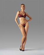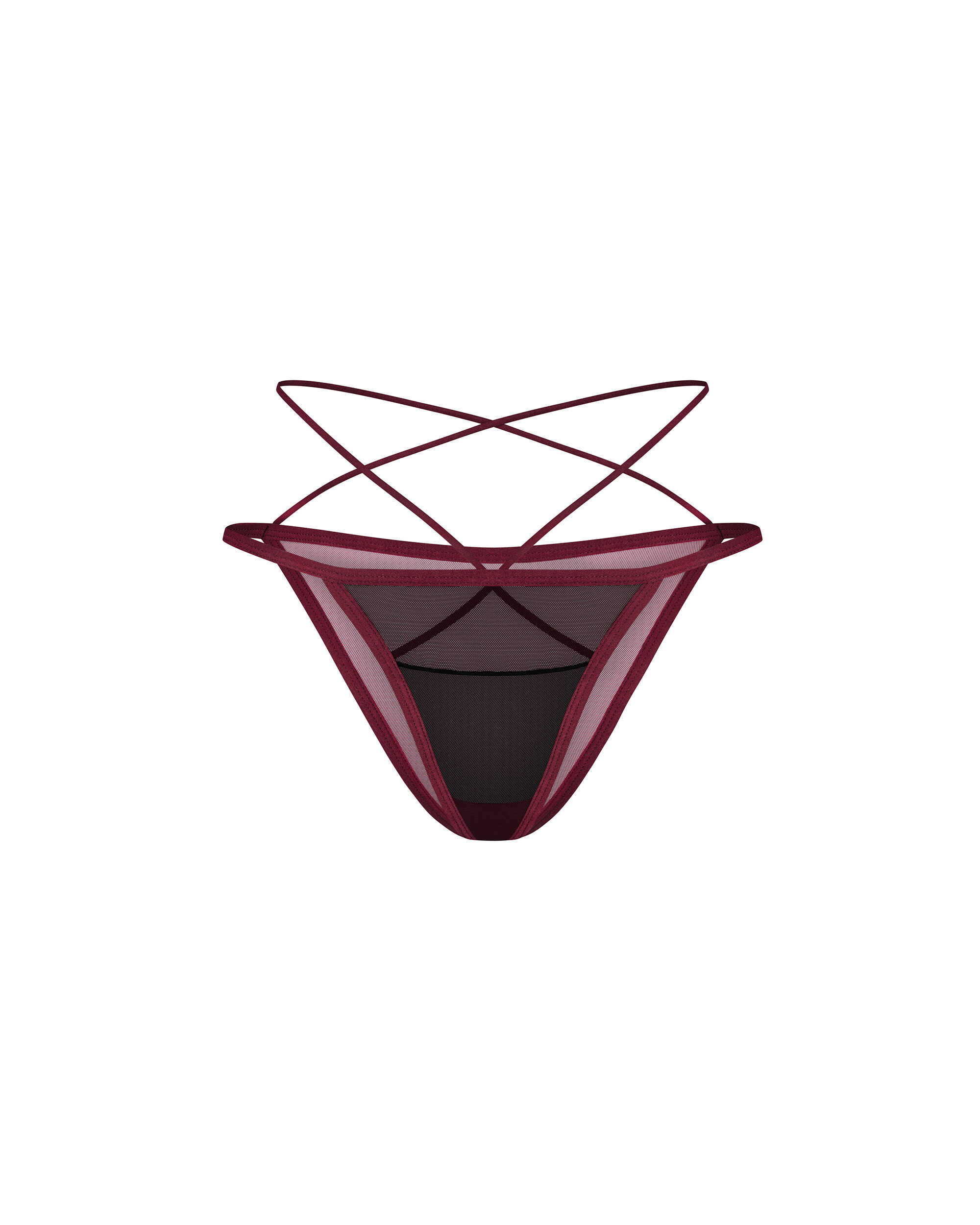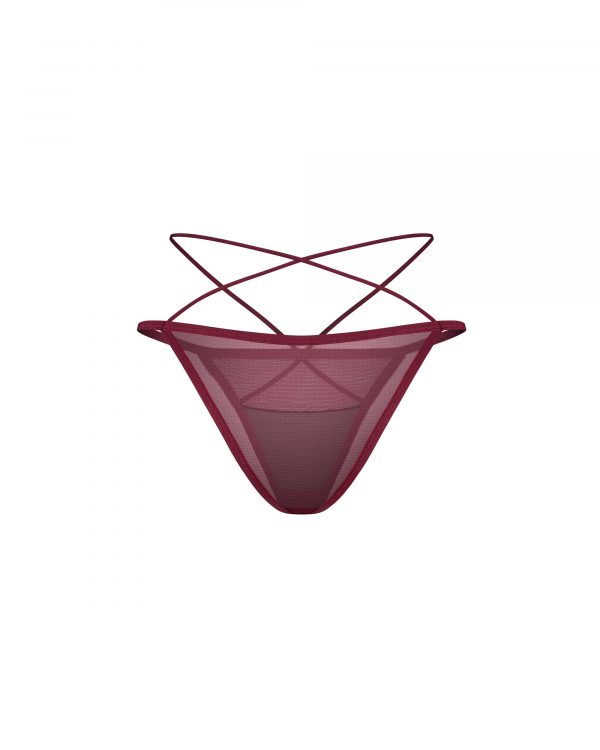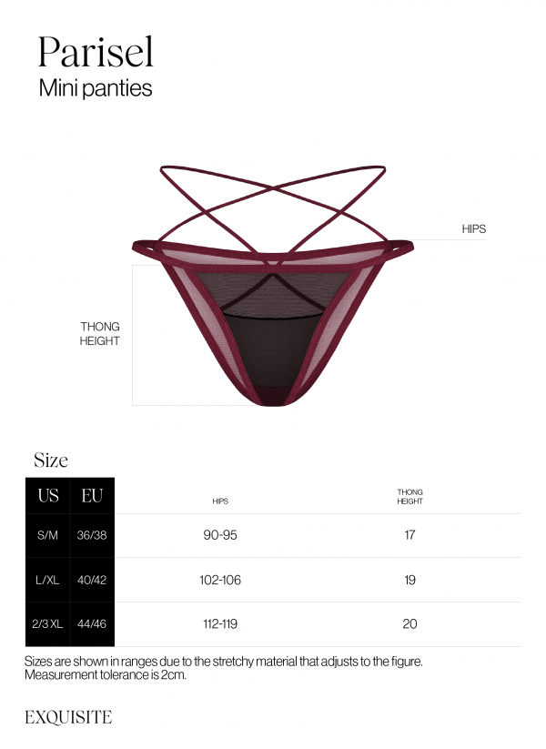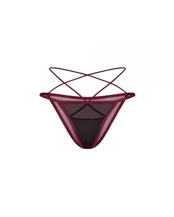 Parisel Mini culotte Transformez votre jeu de lingerie avec les culottes Parisel Mini en bordeaux profond avec des accents noirs frappants et une garniture élégante le long des hanches exsude sophistication. En filet transparent, elles sont dotées de bretelles délicates à l?avant et à l?arrière, ajoutant une touche d?allure à leur sensation douce et luxueuse.? culotte bordeaux et noire- élégants détails de la hanche- tissu en filet souple et transparent ? 94 % polyamide, 6 % élasthanne- Conçu dans l?UE ? sans nickel pour les peaux sensibles