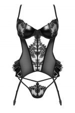Cet ensemble de lingerie exceptionnel Rafaella Corset allie élégance et style sensuel. Fabriqué en dentelle, tulle et wetlook, il met magnifiquement en valeur la silhouette féminine, ce qui renforce la confiance. Le soutien-gorge à armatures avec des bonnets en dentelle accentue la poitrine tout en offrant du confort. Le corset sensuel avec des découpes subtiles et volants au dos accentue la taille, et les bretelles réglables de la cuisse complètent le design séduisant. L?ensemble est fini avec des strings sensuels qui s?harmonisent parfaitement avec le reste de l?ensemble. Matériel : Dentelle, tulle et wetlook assurent un look élégant et sensuel. Corset : Comprend des découpes et des volants décoratifs qui rehaussent la taille, avec des armatures pour le soutien. Thongs : Délicat et sensuel, complétant parfaitement l?ensemble. Sangles réglables : Dans le corset et les bretelles de la cuisse, assurant un ajustement parfait pour toute forme du corps. Arrière : Orné de volants, ajoutant charme féminin et légèreté. Emballage : L?ensemble est emballé dans une boîte élégante avec le corset, ce qui le rend parfait pour un cadeau.Le design unique et les détails délicats font de cet ensemble la quintessence de l?élégance, vous donnant confiance et allure.Messieurs, donnez à votre bien-aimé quelque chose dont il se souviendra longtemps.Taille : S/M et L/XLTaille S/M : (Poitrine : 81-91 cm, B-C, Taille : 56-71 cm, Hanche : 85-97 cm)Taille L/XL : (Poitrine : 91-107 cm, C-D, Taille : 71-91 cm, Hanche : 97-112 cm)Matière : 88 % polyester, 12 % élasthanne