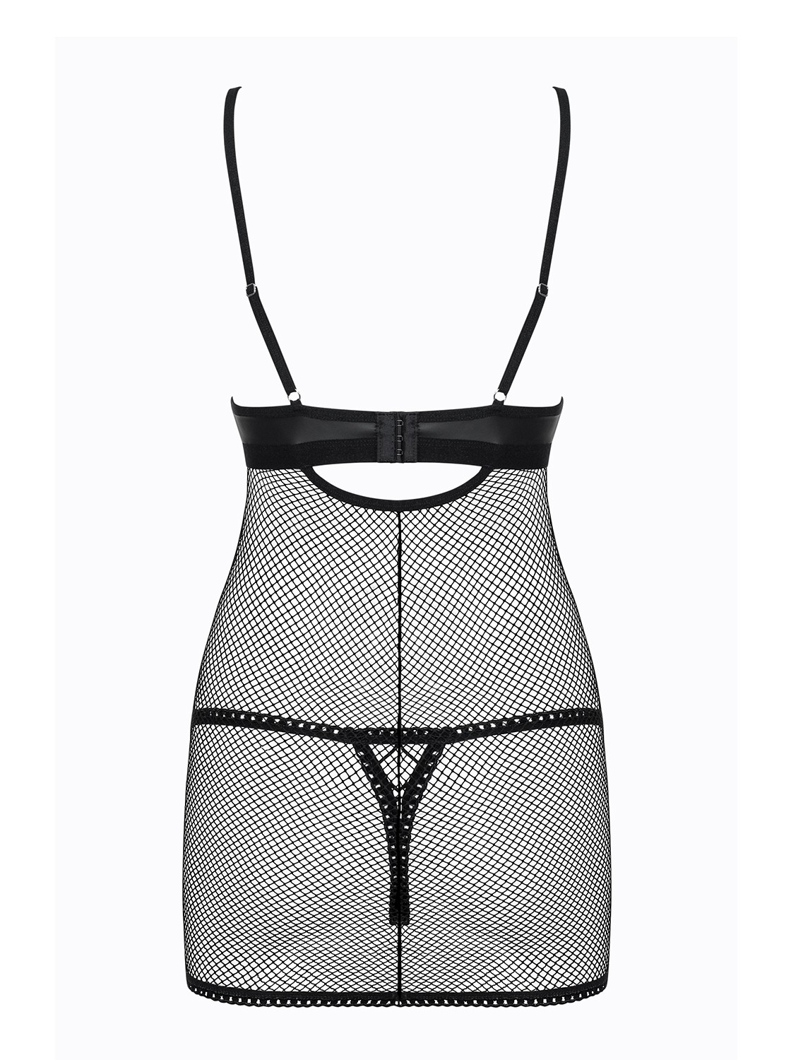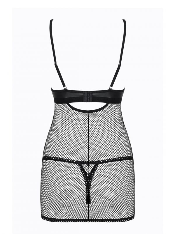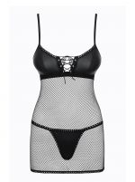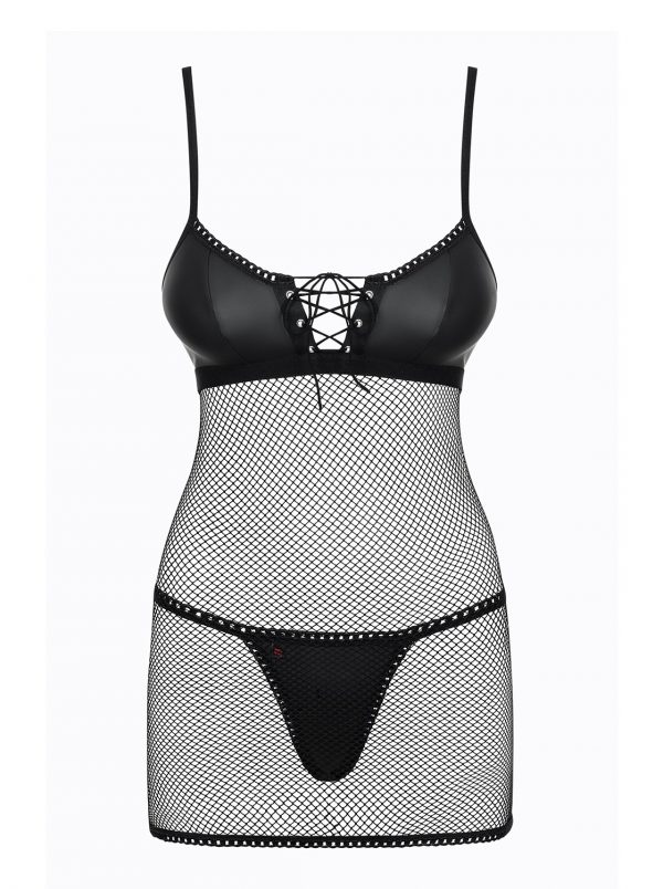 Belle et rebelle ? cette nuisette est faites pour vous !Subtil mélange d’un tissu effet « cuir » et de maille filet, la nuisette dévoile votre peau tandis que le string assorti souligne votre chute de rein. A vous de jouer avec le laçage de la poitrine pour stimuler son imagination….Filet multistrech parfaitement élastiqueTissu effet « cuir »Bretelles et fermeture règlables ajustement parfaitLaçage sexy et ajustable sur le devantLivré avec le string assortiTissus douxComposition : 90% polyamide, 10% élasthanne
