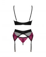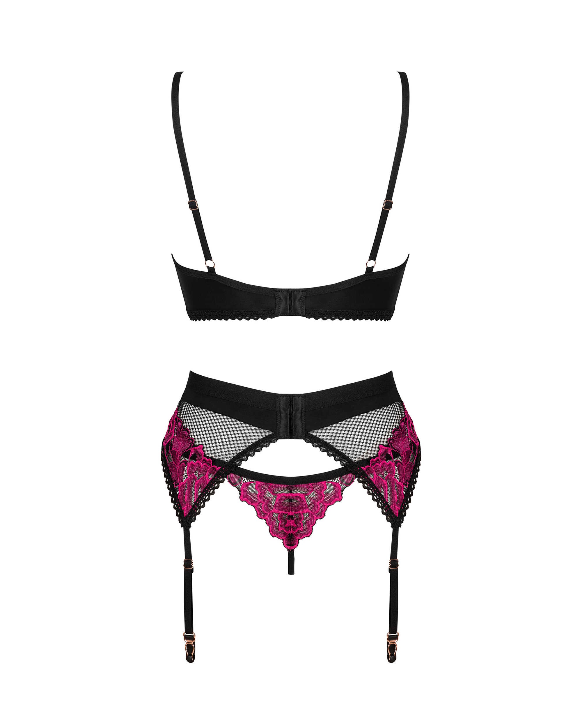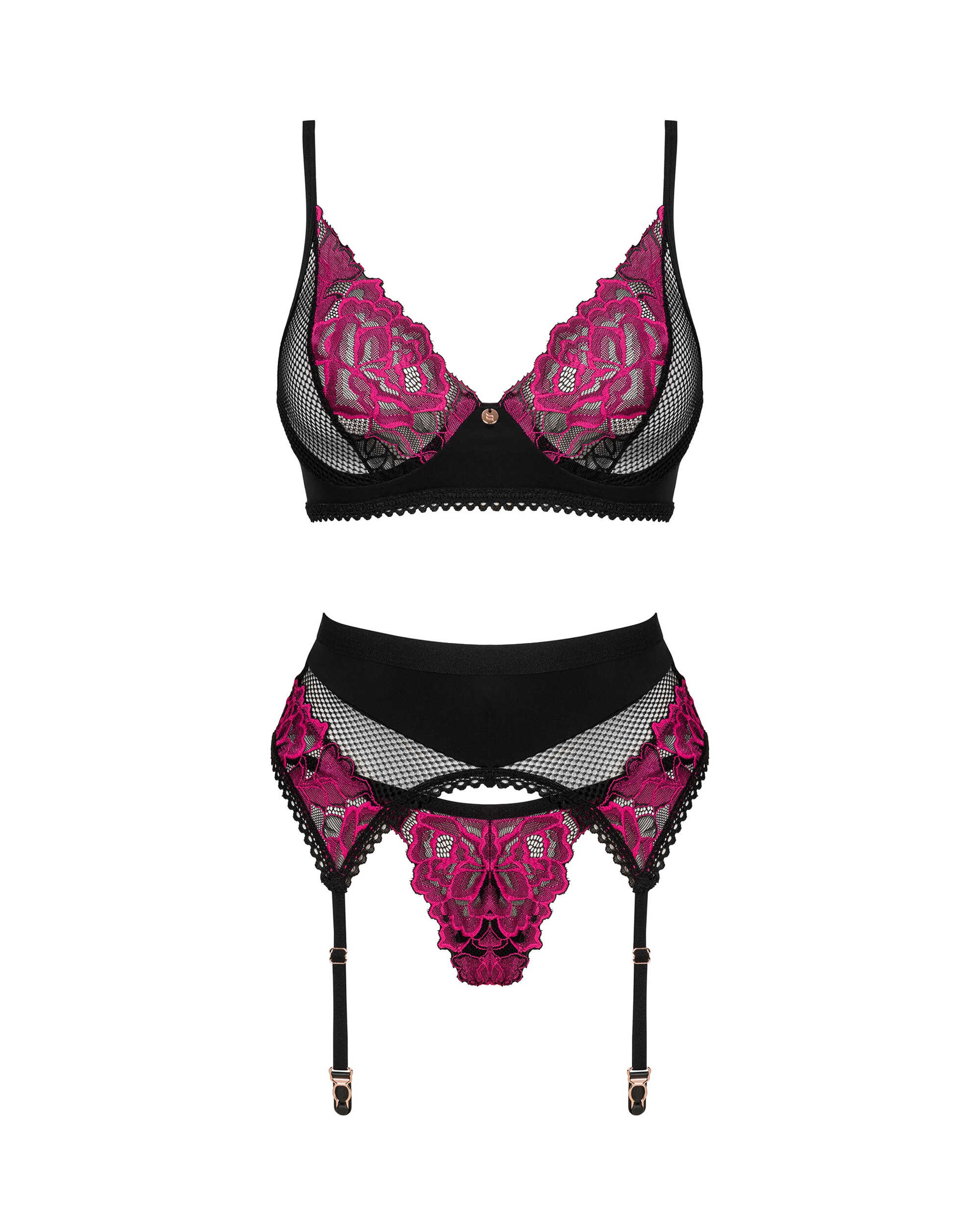 Ensemble 3 pièces RosentyCélébrez le temps passé ensemble ou offrez-vous un cadeau de rêve en choisissant un magnifique ensemble Rosenty ! Sentez vos sens s’affoler lorsque vous enfilez ce magnifique string, soutien-gorge et porte-jarretelles assorti, décoré de ce motif floral unique. Laissez-vous tenter par une pincée de folie et vous ne le regretterez pas !Découvrez plus de détails :- un ensemble de lingerie composé d’un soutien-gorge, d’un string et d’un porte-jarretelles- un ajustement parfait grâce à la fermeture en plusieurs étapes et aux bretelles réglables- des bonnets à armatures – une mise en valeur parfaite de la poitrine- un pendentif brillant – un complément charmant- une maille sensuelle avec un motif floral- tissus non conventionnels Composition : 90% polyamide, 10% élasthanne