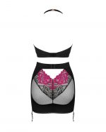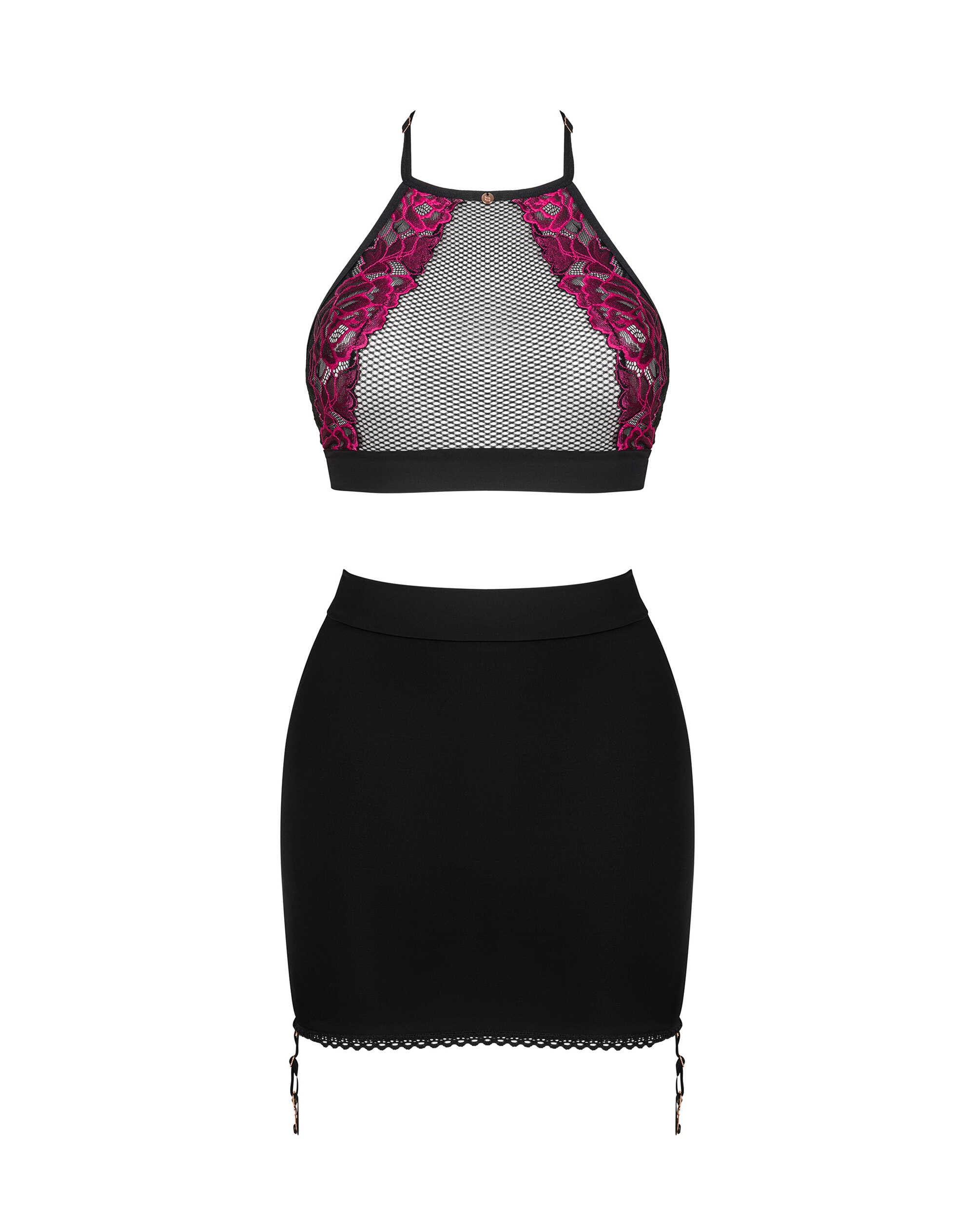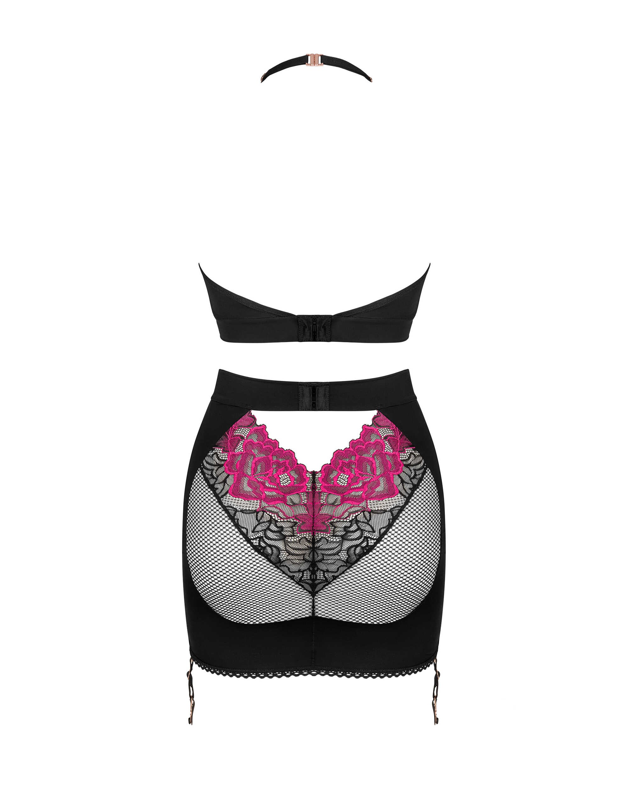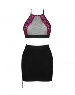 Haut et jupe RosentySi vous êtes attirée par la lingerie unique, comme un papillon de nuit par une flamme, cet ensemble est fait pour vous. La maille transparente souligne avec coquetterie les courbes du buste et des fesses, et le motif floral rehausse le noir sensuel d’une touche de couleur. Découvrez un monde totalement différent où règne l’inventivité sensuelle !Découvrez plus de détails :- top et jupe sexy – ensemble accrocheur- fermeture à plusieurs niveaux et bretelles réglables pour un ajustement parfait- porte-jarretelles amovibles- bretelle d’encolure rehaussant la poitrine – accessoires en or rose- porte-jarretelles permettant d’élargir le style – par exemple en ajoutant des bas assortis- tissus à l’agencement intrigantComposition : 85 % de polyamide, 15 % d’élasthanne
