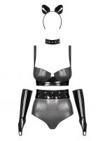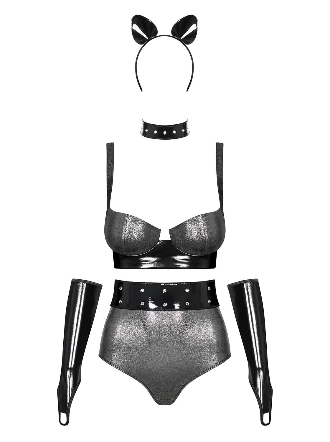 Silveria vient tout droit du futur ! Le mélange d’argenté et de simili cuir vous donnera fiËre allure, sans parler de ces accessoires…†On parie que cet ensemble va réchauffer l’atmosphËre†dans votre chambre ?!†Essayez-le :Culotte ComfyCut taille haute -†souligne les courbesBretelles réglables Bijou entre la poitrineTissu magnifiquement brillant Fermeture confortable et ajustement au corps L’ensemble comprend une culotte, un soutien-gorge, un serre-tÍte oreilles, des gants, une ceinture et un tour de cou Composition : Soutien-gorge, culotte, tour de cou, gants, ceinture – 90% polyamide, 10% élasthanne ;†Serre-tÍte oreilles – 45% PVC, 40% plastique, 10% métal, 5% polyester