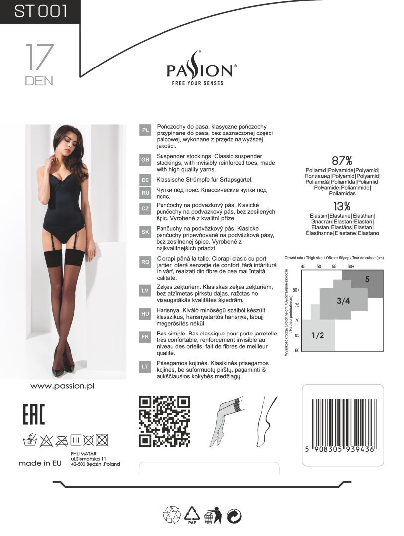 Un modèle classique de bas noirs à associer avec toutes vos guêpières et ensembles de lingerie 3 pièces.Les bas ST001 de la marque Passion de 17 deniers vous offrent finesse et résistance avec leur pointe des pieds renforcée. Composition : 87% polyamide, 13% élasthanne
